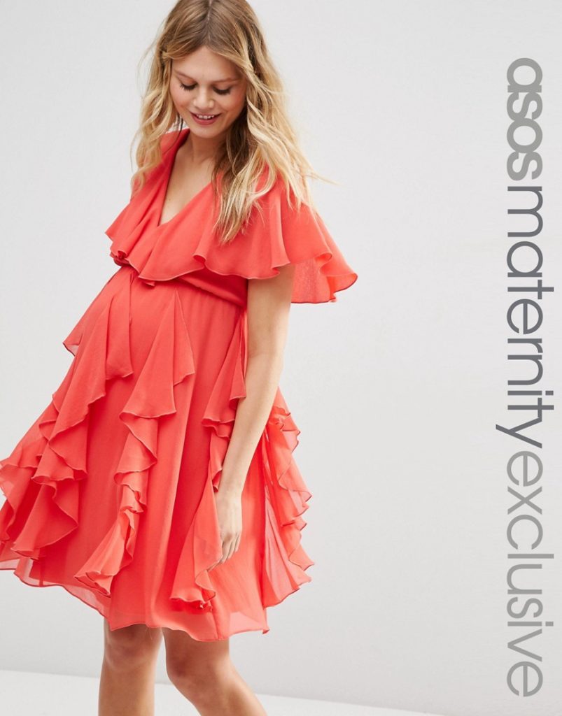 Volant. Per le mamme impegnate nell’allattamento questo abitino a portafoglio color corallo è un’ottima soluzione. I volant doneranno brio alla vostra mise.
