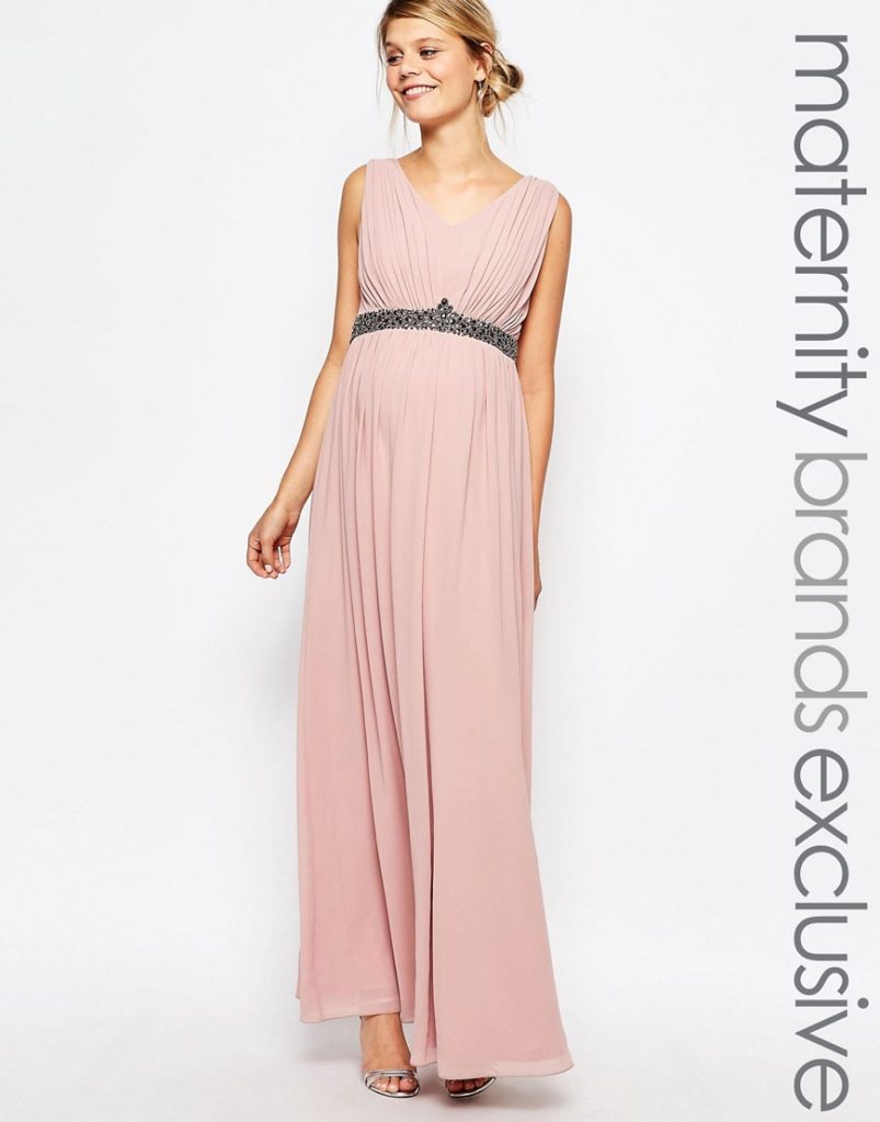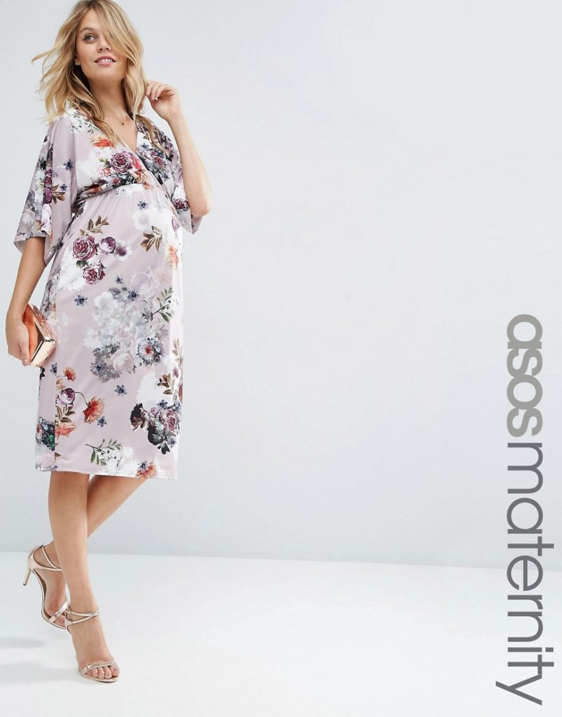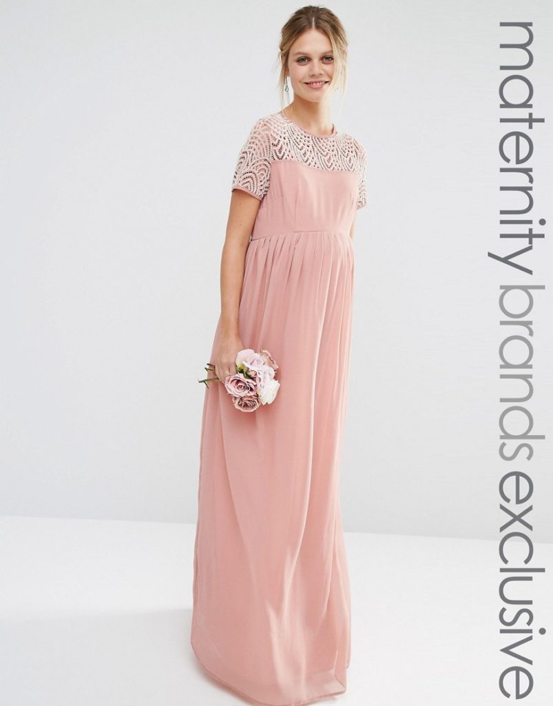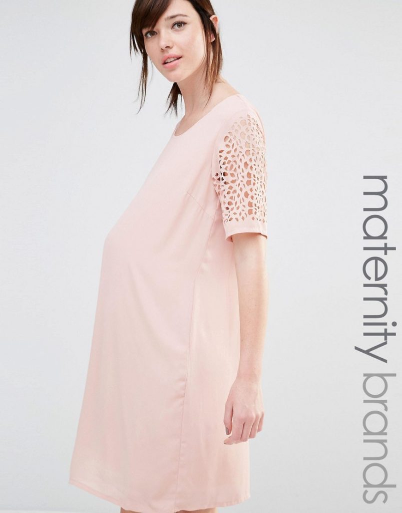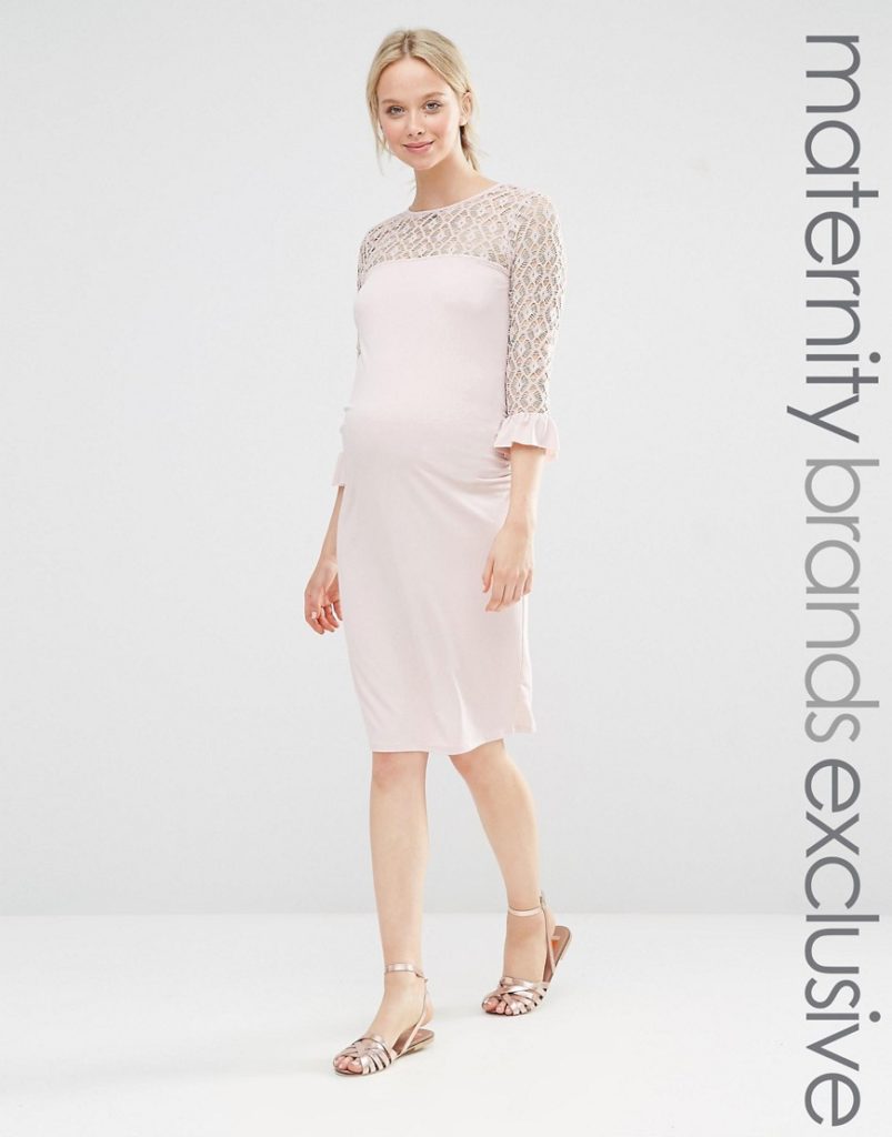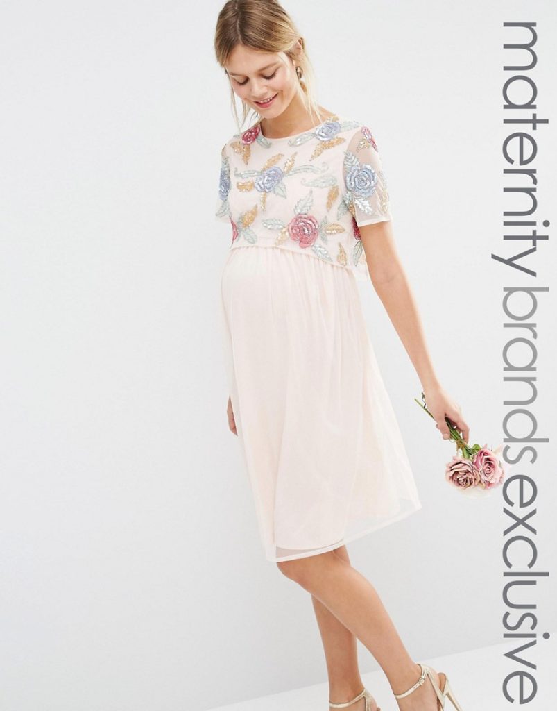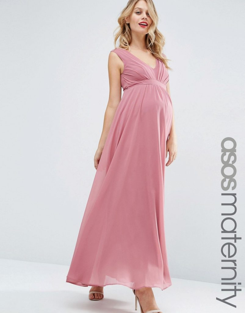 Soavi. Fiore, volant e scollo a v per il vestitino Asos Maternity color rosa cipria.