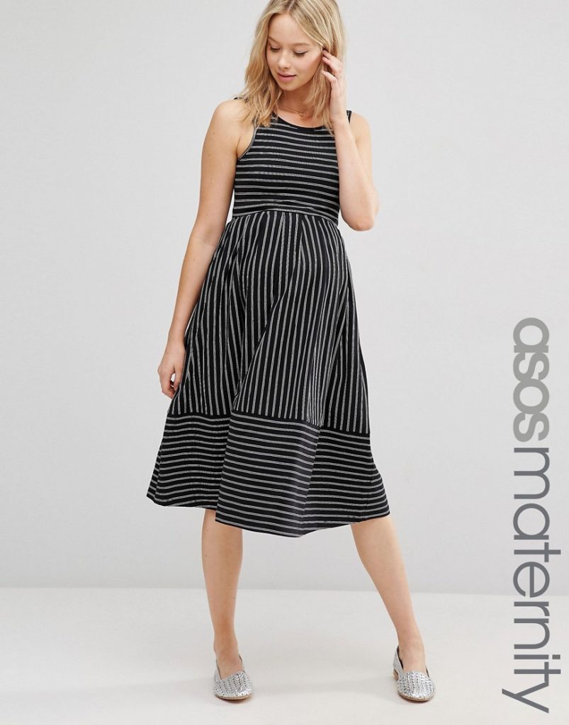 Effetto Marylin (con un po’ di fantasia). La gonna a campana richiama l’immagine di una Marylin bellissima in abito bianco e gonna che svolazza. L’abito Asos Maternity è, però, gessato, a pieghe ed ha un incrocio sul retro. Sì, abbiamo fantasticato un po’ ma, voi mamme, siete così belle!