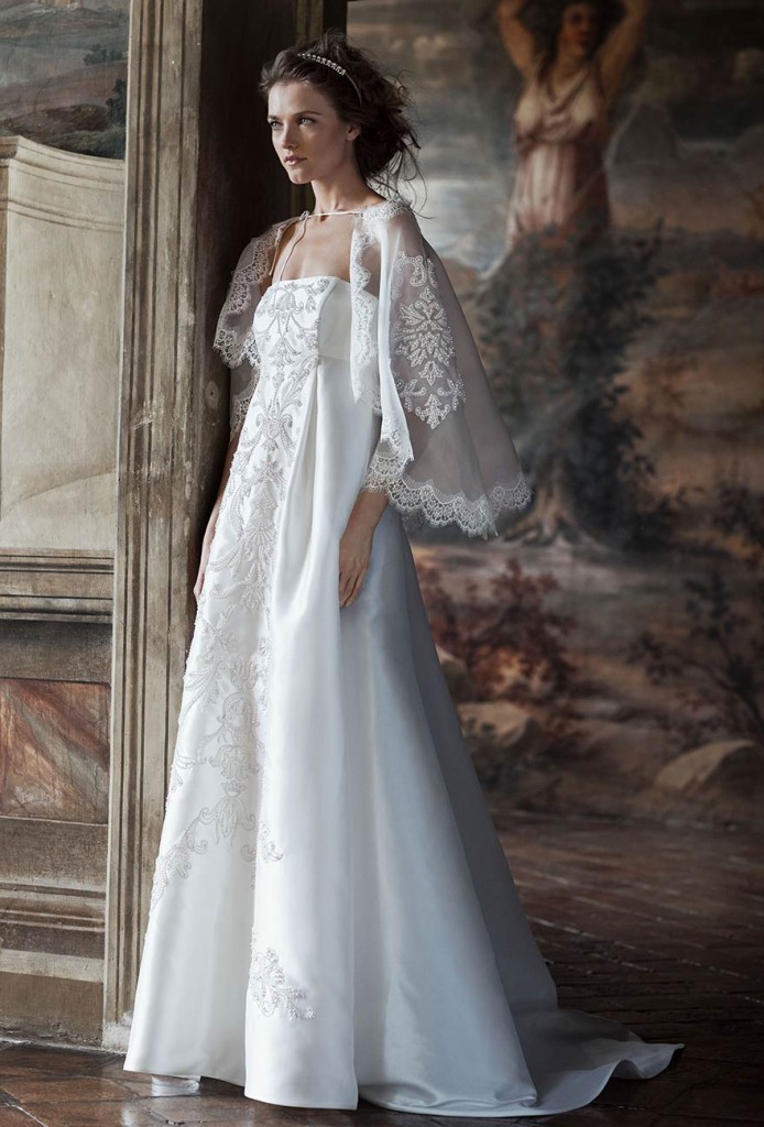 Tiche immancabile lo stile impero in mikado di seta impreziosito da perle e da una mantellina in pizzo dal gusto un po’ retrò