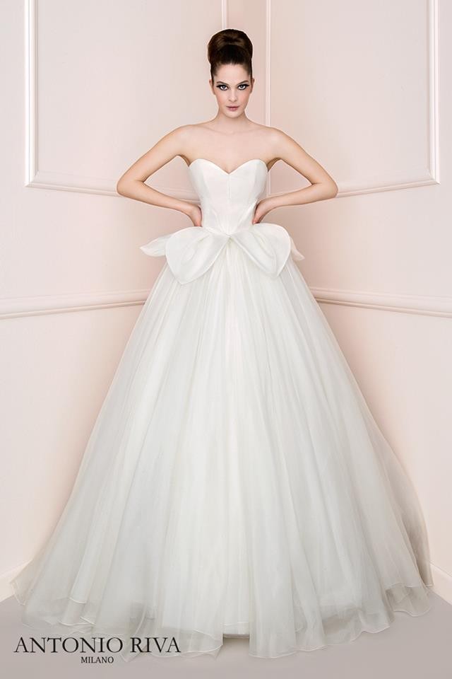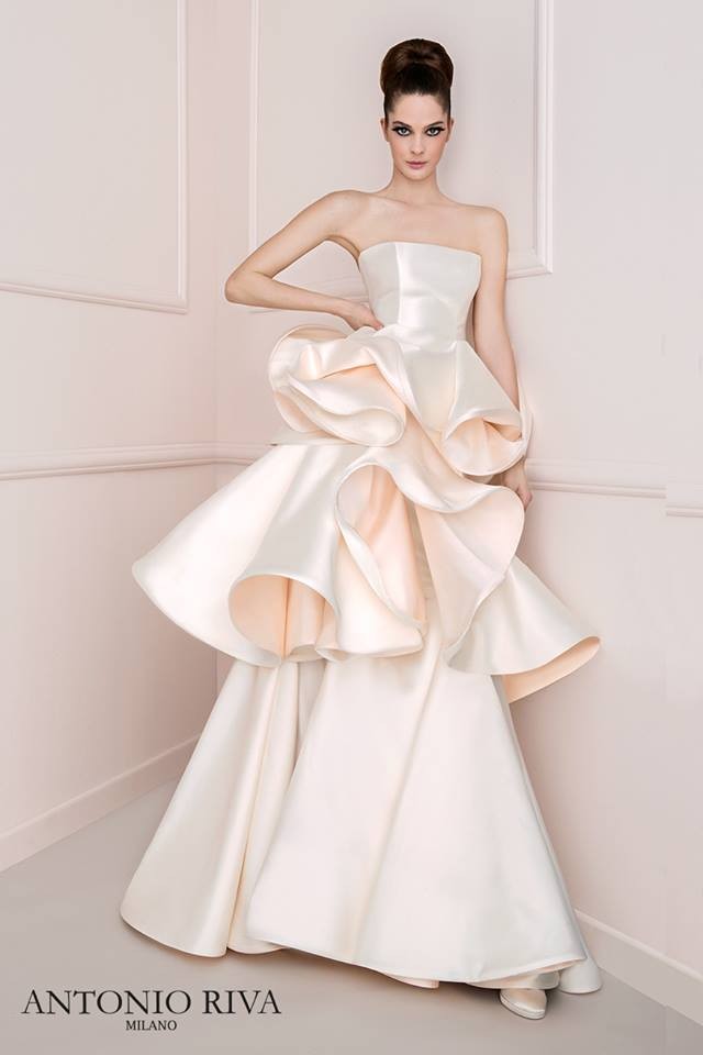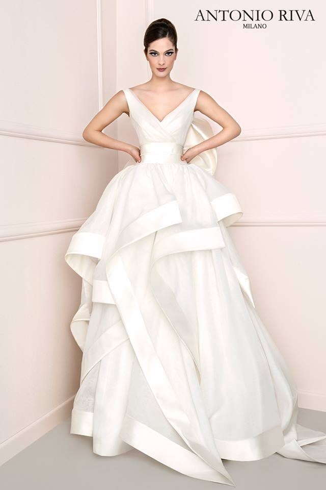 La scelta dei tessuti per Antonio Riva non è mai casuale, lo studio e la ricerca di materiali pregiati che valorizzano la silhouette, sono da sempre posti in primo piano dedicando un’attenzione quasi maniacale alle selezione, il risultato sono creazioni spettacolari. I tessuti sono quindi leggeri e allo stesso tempo strutturati e la preferenza cade sul mikado di seta, organza, pizzo chantilly e pizzo valencienne. Dai giochi di volumi ampi date alle gonne e dai modelli che sfiorano la pelle si ottengono linee molto definite e scultoree perfette per spose sbarazzina e molto sofisticate.
