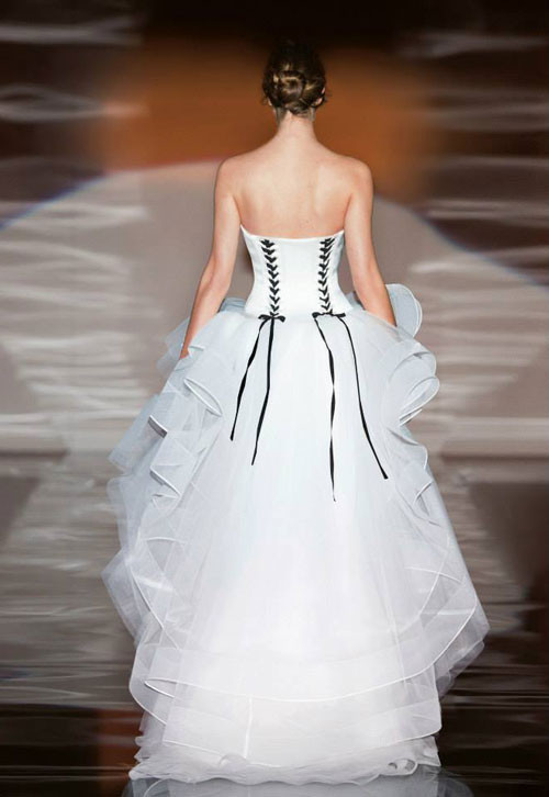 Ultimo tocco di stile sono i dettagli in nero proposti su corsetti, pizzo, e gonne… un abbinamento delicato e fashion esaltato ancora di più dalle tre nuance base scelte dalla maison: avorio, cipria e bianco.