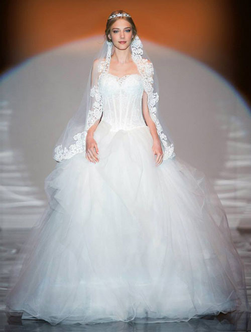 I modelli nella collezione sono quelli ballgown e a principessa con ampie gonne vaporose in tulle e seta di organza, balze molto particolari a multistrato e meravigliosi corsage ricamati in pizzo.