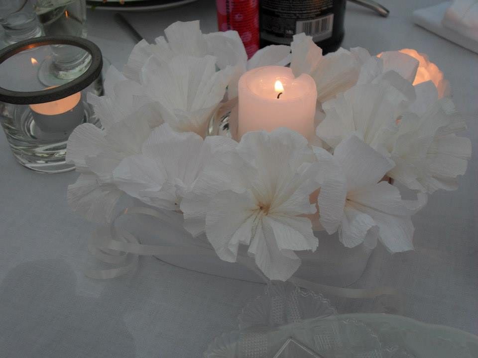Una volta realizzata la composizione floreale dovrete pensare a come posizionarla sui tavoli, come legarla e la forma che desiderate dare al tutto. Potrete prendere ciotole, contenitori di vetro, “diamanti” di luce sparsi sulla tovaglia, bottiglie e qualsiasi altro contenitore. Se scegliete le candele fate bene attenzione ad inserirle in un contenitore per evitare il diretto contatto con la carta!