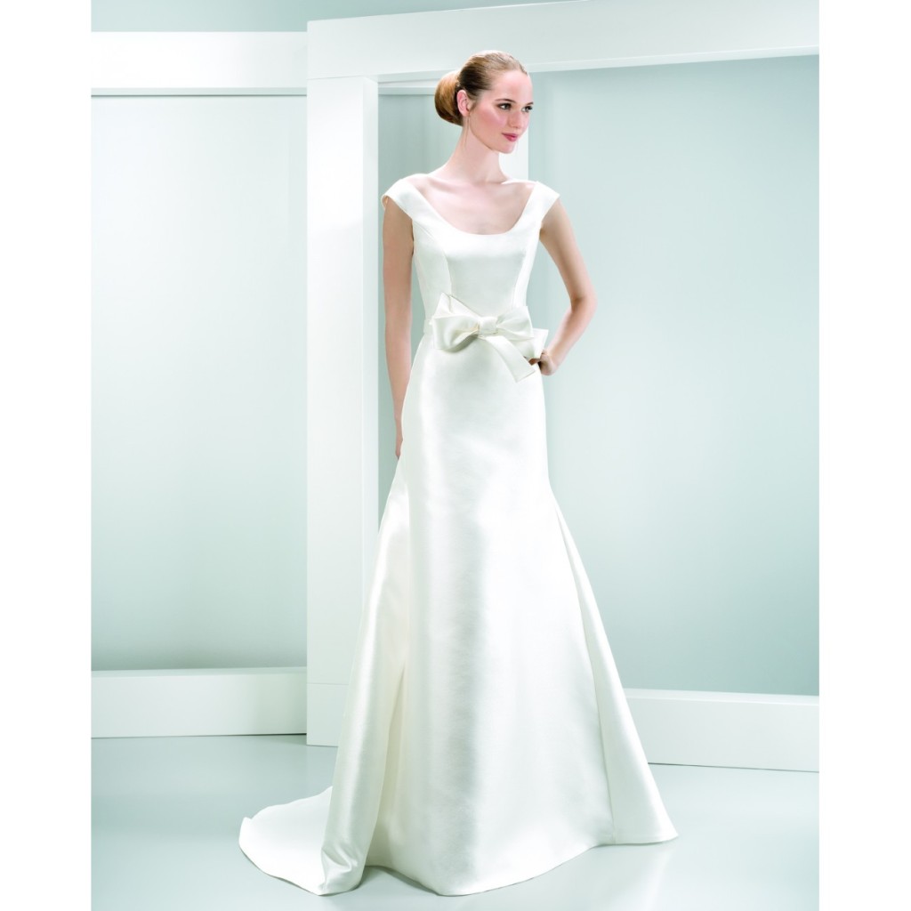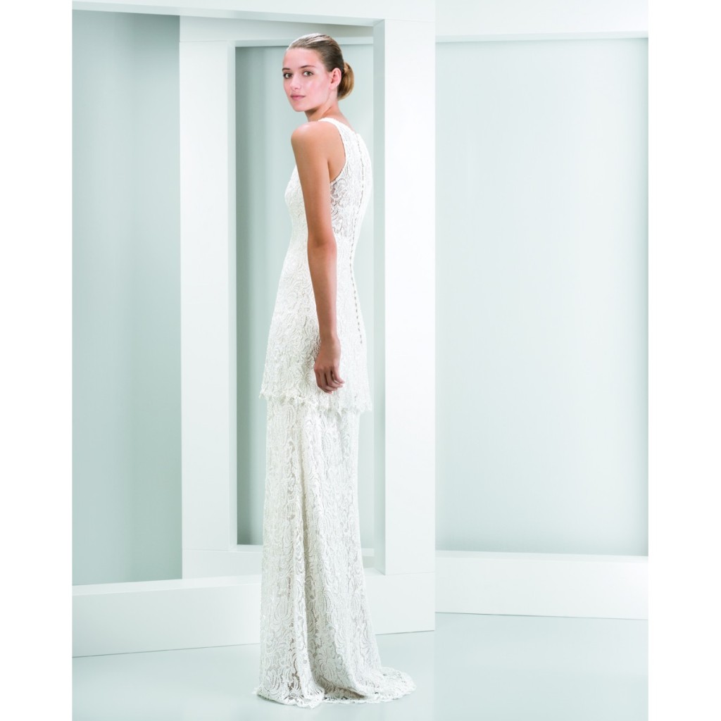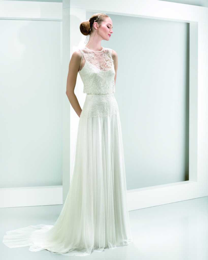 Tra le tendenze proposte dalla Maison il vestito con gonna a vita bassa occupa un posto di primo piano, realizzati con corpetti più lunghi aderiscono fino ai fianchi da cui partono poi gonne scivolate che si aprono delicatamente. Ad alcuni di questi la stilista ha accostati dei crop top da sposa, dal gusto un po’ moderno, sui quali troviamo delle lavorazioni a traforo, ornamenti brillanti o meravigliosi e provocatori pizzi neri.