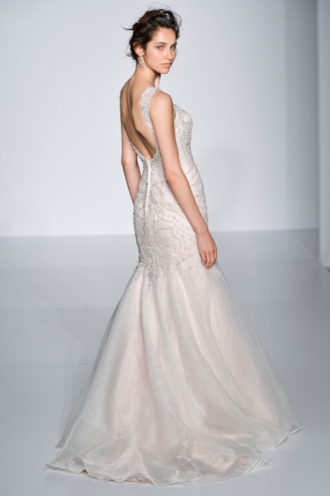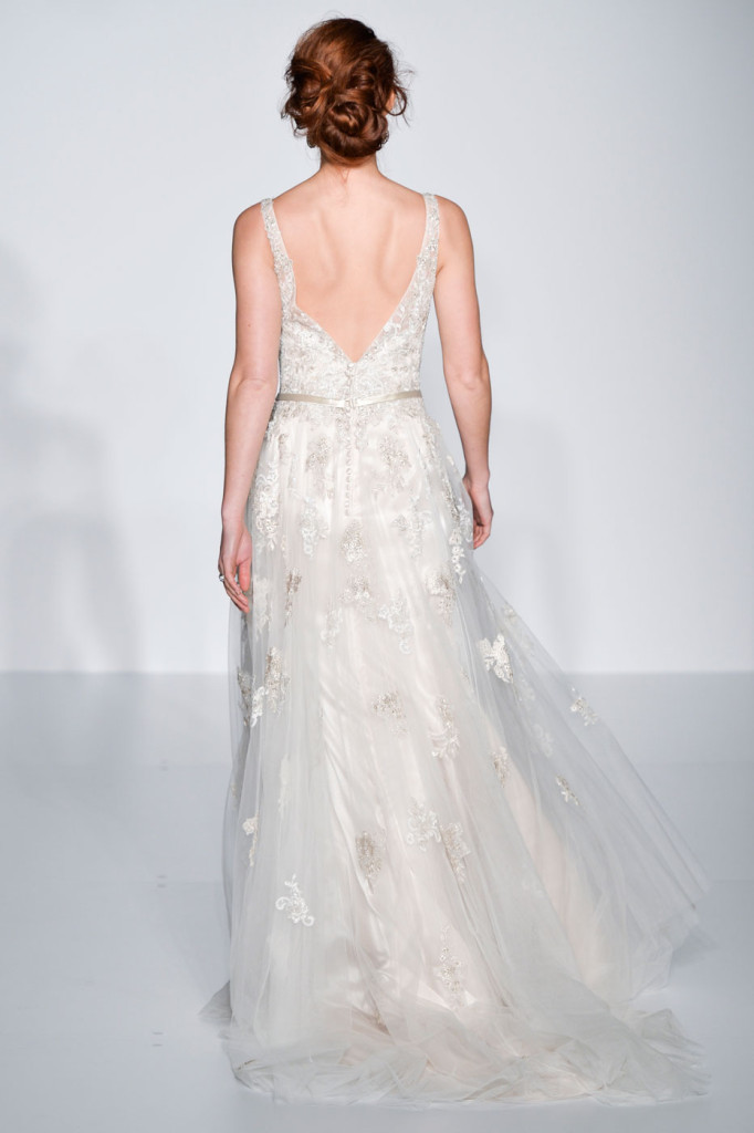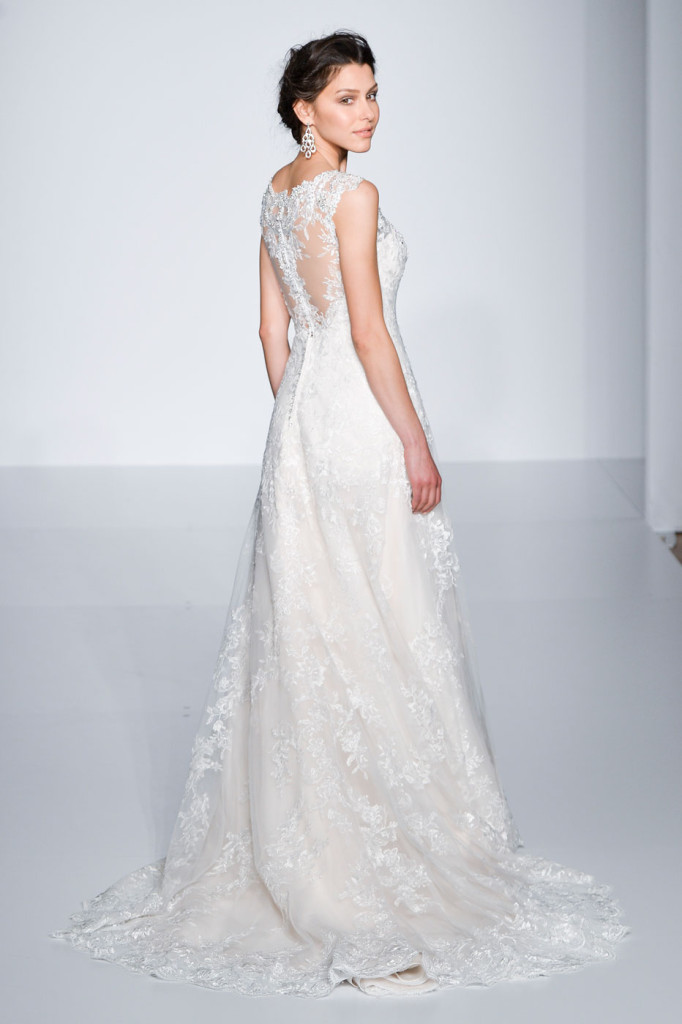 La vera particolarità degli abiti in passerella è la cura dedicata ai dettagli sulla schiena: scollature profonde e seducenti, a volte scoperte altre volte velate e impreziosite da lavorazione in macramè; effetto tatoo sul decolleté, sulla schiena ma anche su braccia e polsi assolutamente spettacolare e sorprendente da lasciare lo spettatore che osserva senza fiato. Una sposa elegante, glamour che fa del suo fascino un’arma di seduzione, sicura e determinata a sedurre chiunque la guardi, amante del pizzo macramè, di pietre brillanti  e di inserti mesh che lasciano intravedere piccoli strati di pelle.