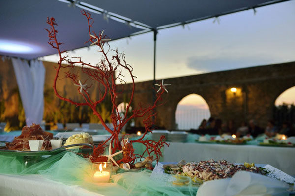 La tavola è uno degli elementi dove ci si può sbizzarrire con i decori utilizzando ad esempio con un runner color acquamarina posizionato su una tovaglia bianca oppure realizzando un centrotavola di impatto con sabbia, stelle e candele che si abbineranno a graziosi segnaposti da regalare ai tuoi invitati come ricordo del matrimonio.