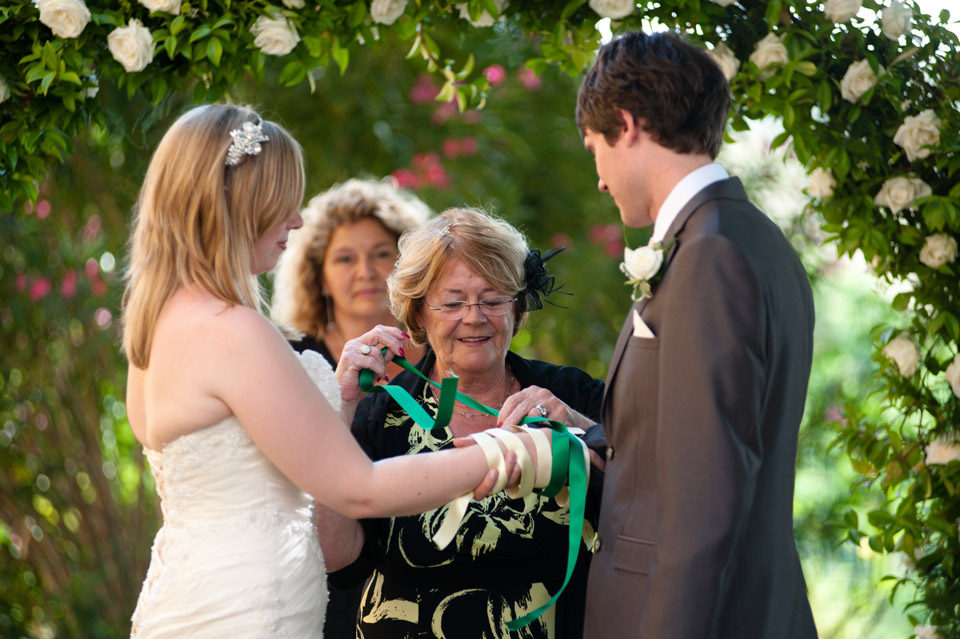 Gli sposi, uno di fronte all’altra occhi negli occhi, si tengono le mani che saranno poi avvolte insieme da una corda cerimoniale, preferibilmente di colore bianco e rosso (Dea e Dio, Femminile e Maschile), che simboleggia il loro vincolo di unione.