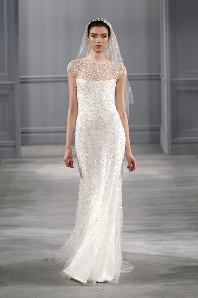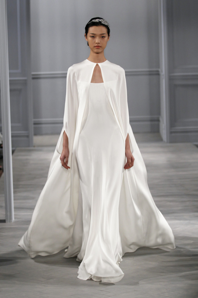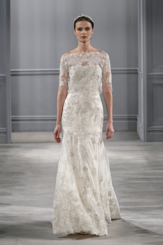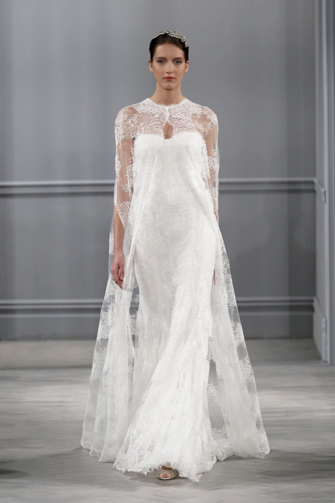 Si chiama Sandrine il modello senza tempo disegnato da Monique Lhuillier per la linea sposa 2014: l’abito non ha spalline, ha una scollatura a cuore, è off-white, in pizzo ed è adornato da una lunga mantella velata e lavorata.