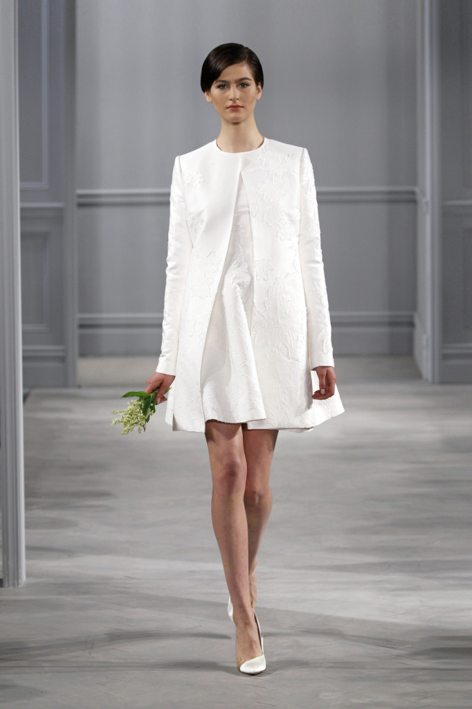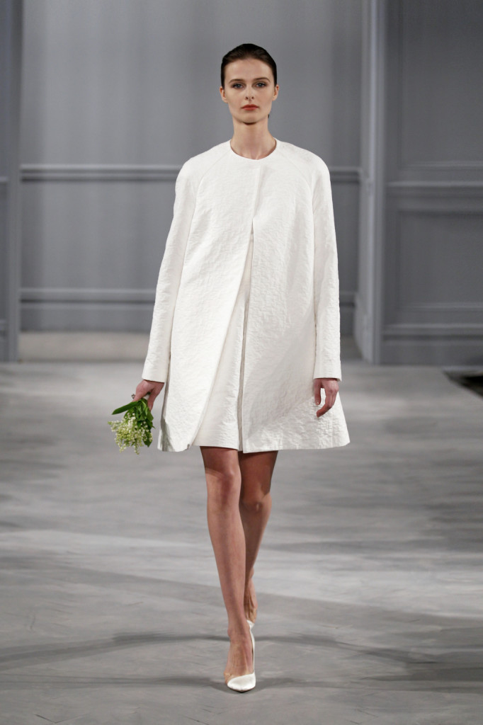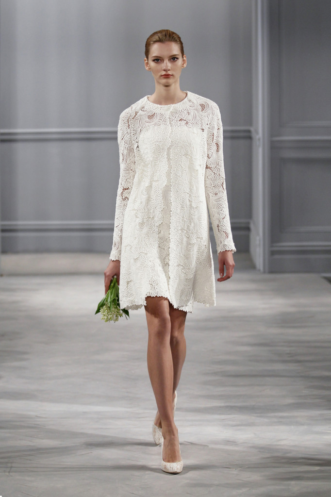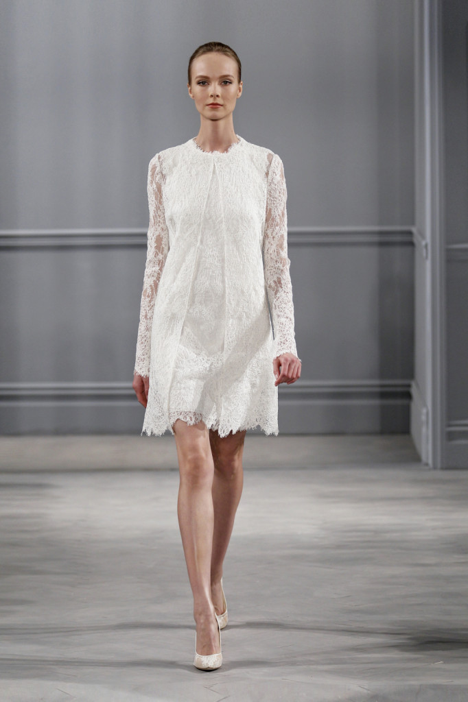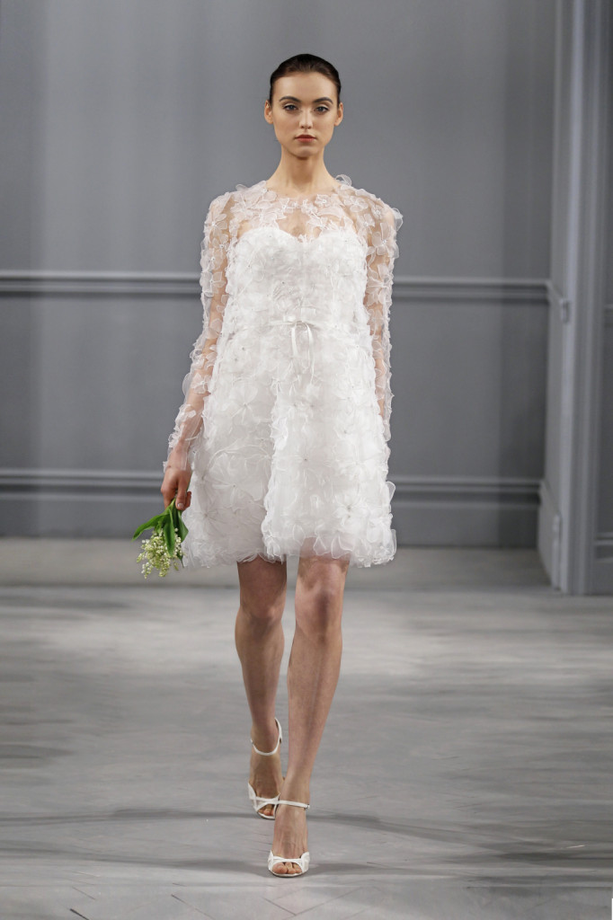 Si chiama Sandrine il modello senza tempo disegnato da Monique Lhuillier per la linea sposa 2014: l’abito non ha spalline, ha una scollatura a cuore, è off-white, in pizzo ed è adornato da una lunga mantella velata e lavorata.