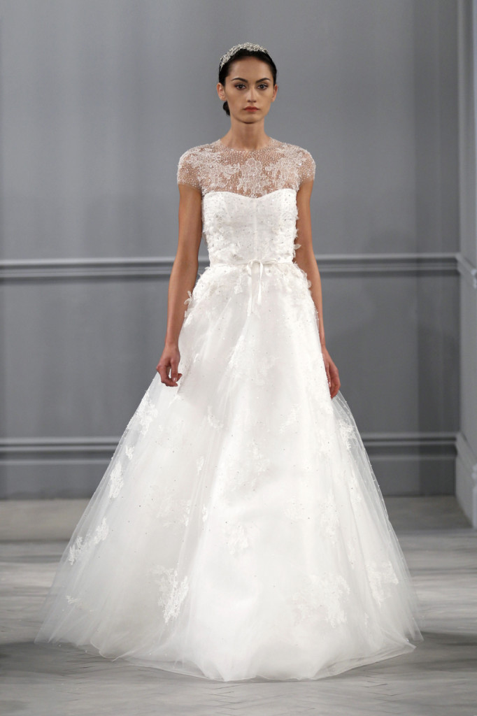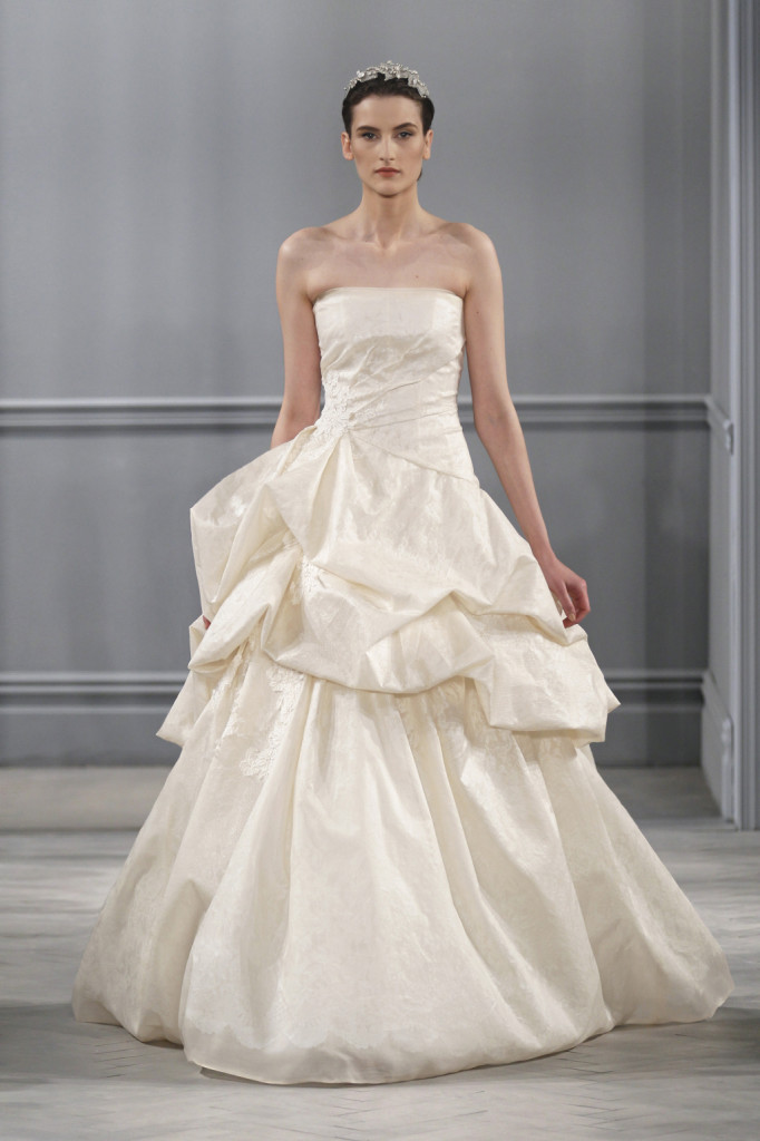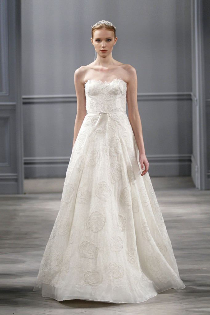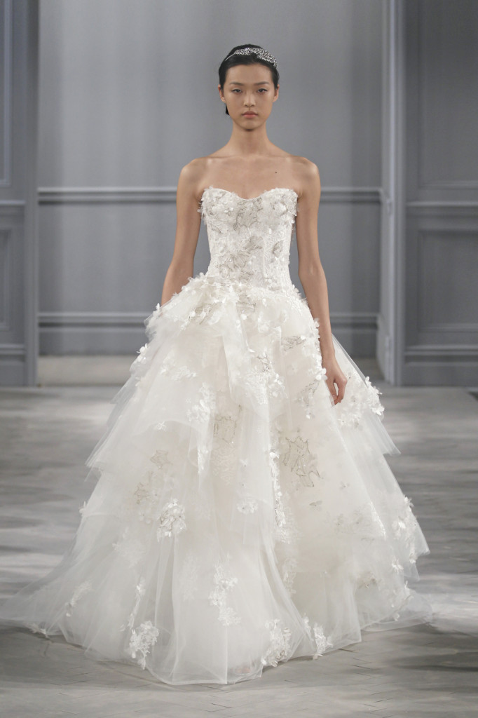 Della stilista Monique Lhuillier sono famosi gli abiti ballgown. Un esempio? L’abito ballgown in tulle, organza, ramage, con tema floreale e ricami di perline. Della collezione fanno parte anche due abiti champagne: uno con increspature e inserti in pizzo, l’altro sembra uscito dalla Hollywood degli anni ’50 ed è ballgown in organza con scollo a cuore. Per concludere la fiaba, con tanto di regina, c’è il ballgown arricchito da tulle, pizzo, ricami e fiori applicati. Un abito d’avanguardia è il peplum dress, dove tulle e pizzo partecipano nel conferire un effetto scultura. Un altro modello peplum dress è quello con le applicazioni in fiori di tessuto ad arricchire l’ampio velo.