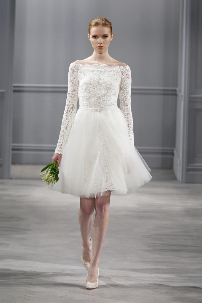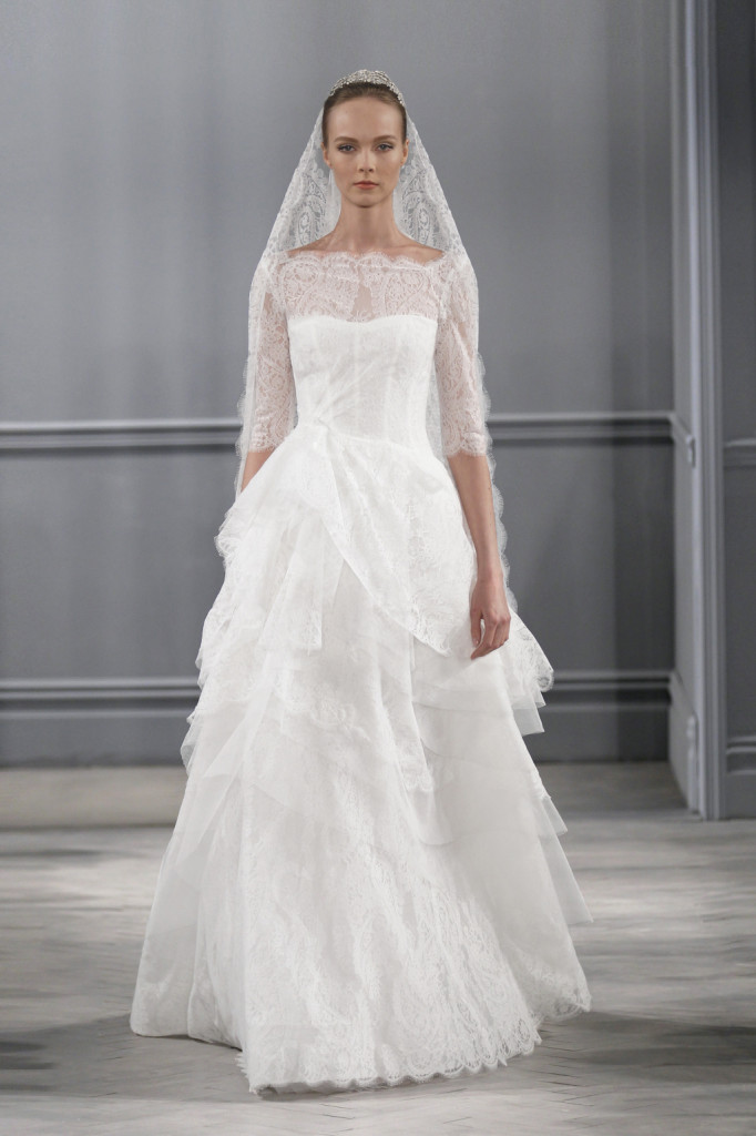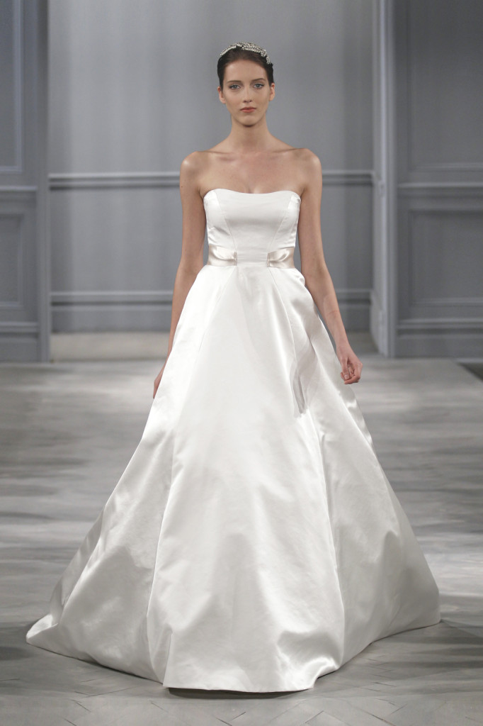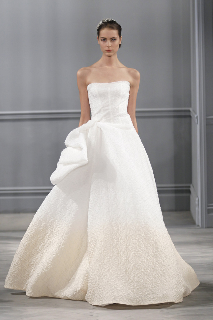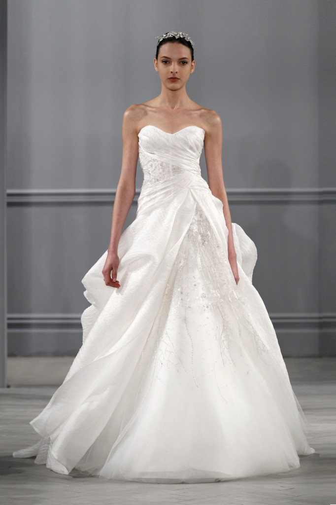 Della stilista Monique Lhuillier sono famosi gli abiti ballgown. Un esempio? L’abito ballgown in tulle, organza, ramage, con tema floreale e ricami di perline. Della collezione fanno parte anche due abiti champagne: uno con increspature e inserti in pizzo, l’altro sembra uscito dalla Hollywood degli anni ’50 ed è ballgown in organza con scollo a cuore. Per concludere la fiaba, con tanto di regina, c’è il ballgown arricchito da tulle, pizzo, ricami e fiori applicati. Un abito d’avanguardia è il peplum dress, dove tulle e pizzo partecipano nel conferire un effetto scultura. Un altro modello peplum dress è quello con le applicazioni in fiori di tessuto ad arricchire l’ampio velo.
