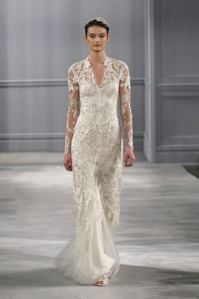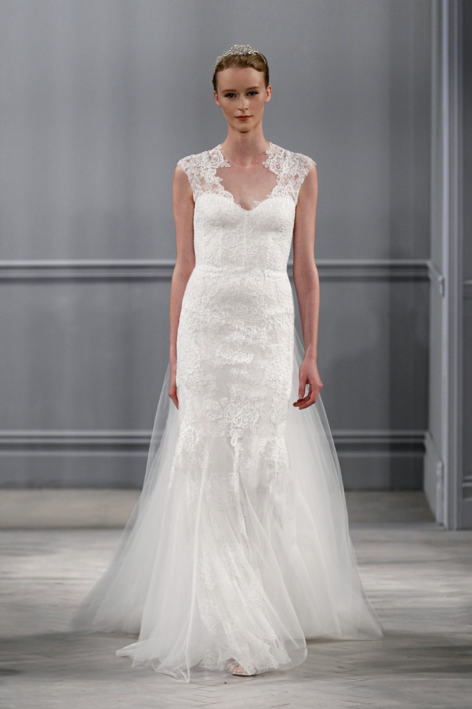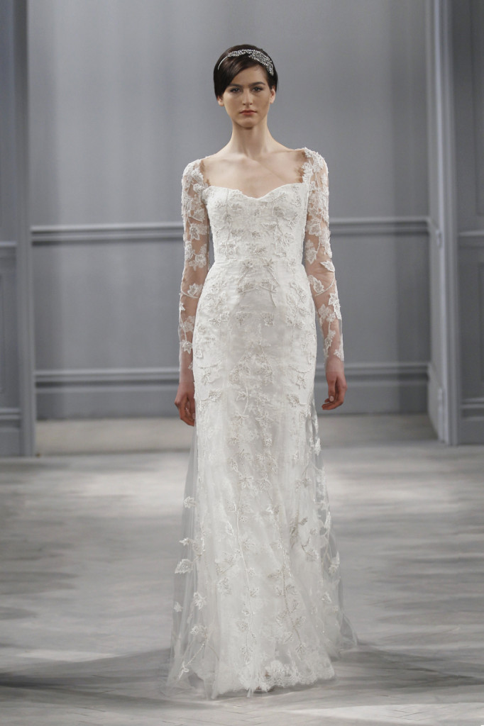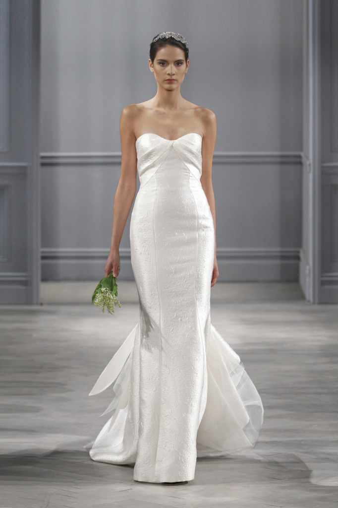 Nella linea bridal Monique Lhuillier non mancano i modelli a sirena: Intrigue, stretto fino ai fianchi che si apre con sensuale leggerezza, Isla, realizzato in tessuto mikado effetto perlato, ed Estelle. Merita una certa attenzione anche l’abito A-line con scollo a cuore in pizzo e ricami in grandi fiori.