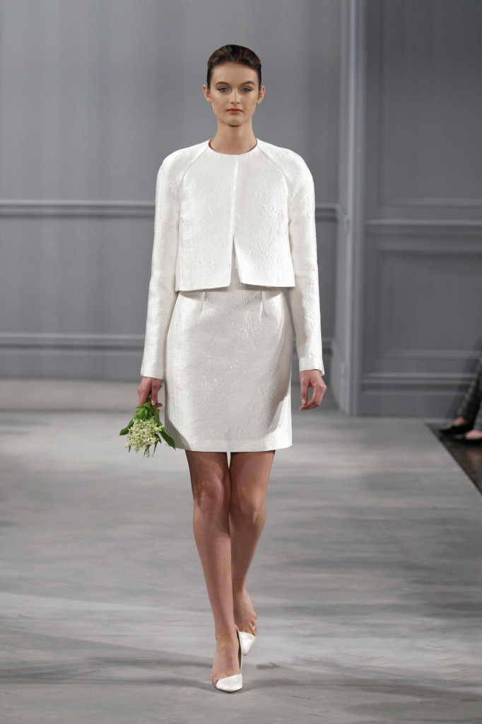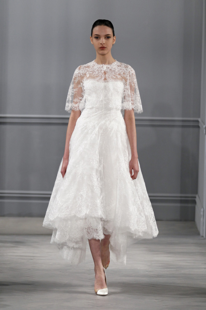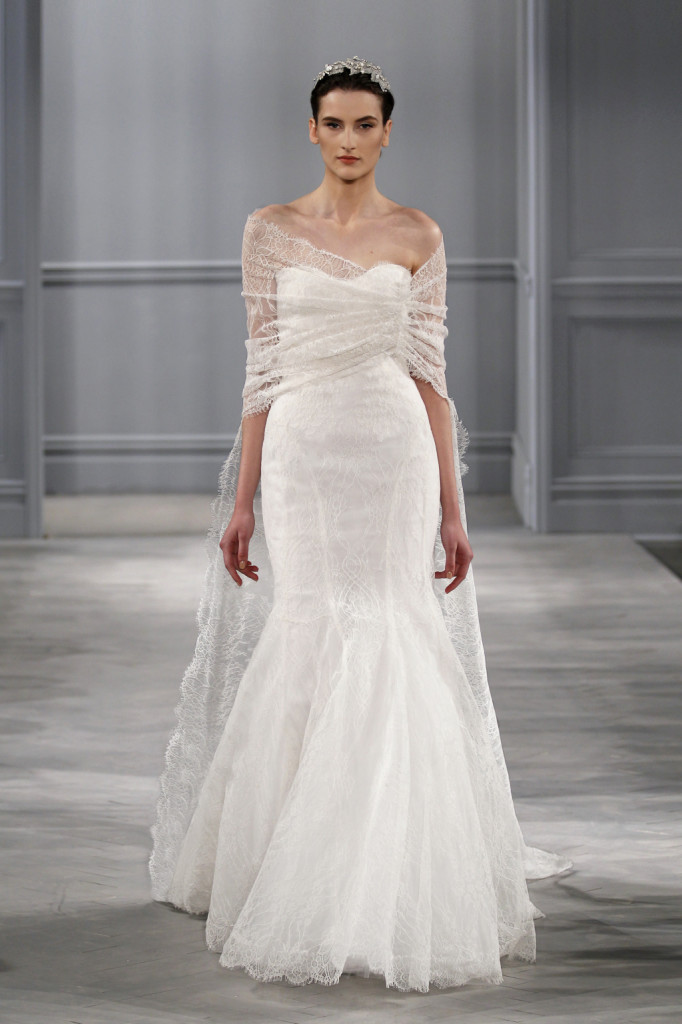 La mantella è un perfetto accessorio da sposa e, nella versione lunga, è abbinata ad un abito scivolato senza spalline e con scollo a cuore. Tra gli outfit da sposa c’è anche la stola in pizzo drappeggiato asimmetricamente che termina sul retro in un lungo strascico e viene sccostata all’abito da sposa Monique Lhuillier con bustier in pizzo a campana.