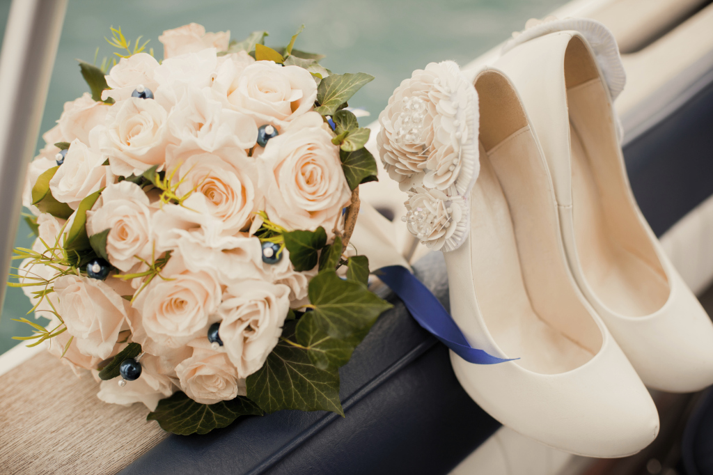 Le scarpe della sposa possono essere rosse, importante abbinare bouquet di rose rosse o rossetto rosso