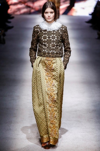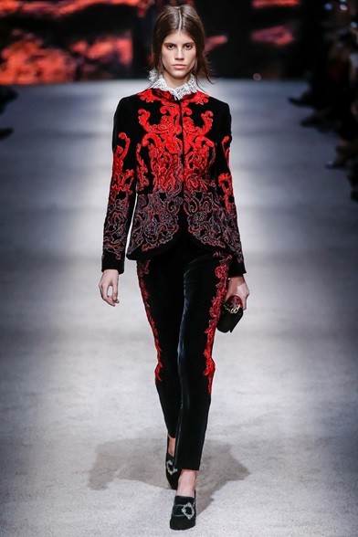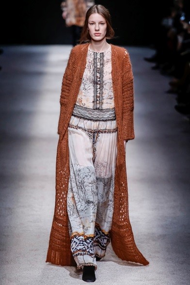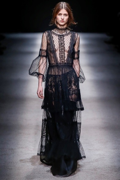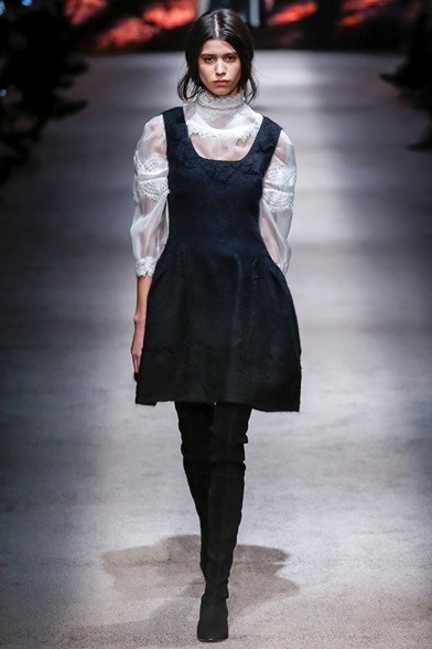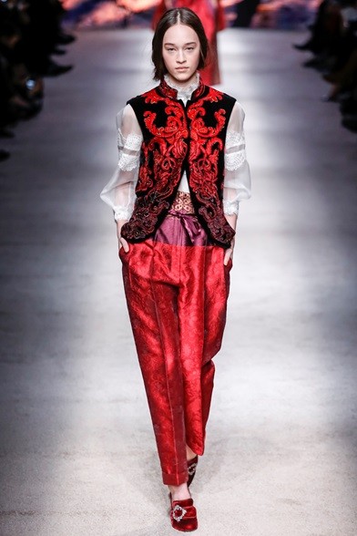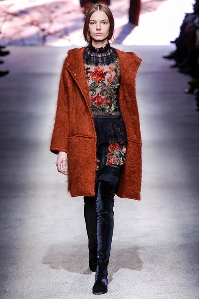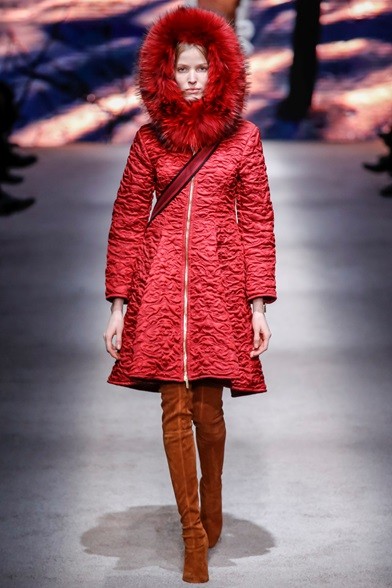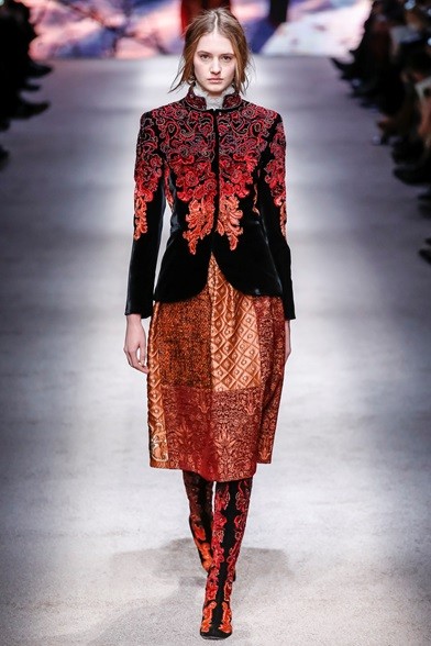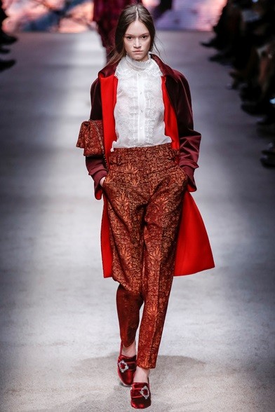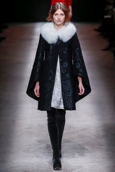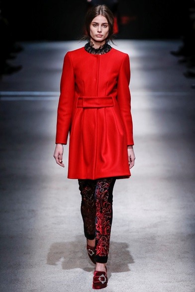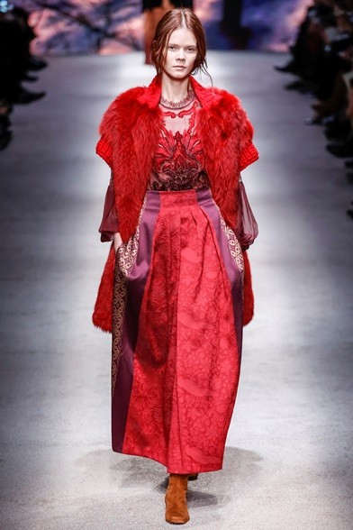 Per il prossimo autunno/inverno 2015-16 la stilista italiana propone una cortigiana che sembra uscita adesso da una sorta di bosco incantato, quell’inno alla natura che mai manca nelle collezioni di Alberta Ferretti come già abbiamo visto in quella precedente. E’ una donna che non vuole apparire, mettersi in mostra, anzi indossa abiti lunghi, realizzati con tessuti coprenti, estremamente eleganti e ricercati nei ricami, nei damaschi e nelle decorazioni. Abiti preziosi per una donna preziosa. Sembrano tavolozze dei colori dei pittori rinascimentali, la loro passione è tutta nel nero, nelle tonalità del rosso, del marrone e del verde, ma anche papavero e fragola, tutti colori ‘caldi’ che si mescolano per realizzare il più bello degli affreschi rinascimentali. I vestiti, lunghi fino ai piedi o più corti, raccontano storie che arrivano dal passato. I cappottini avvolgono la figura femminile senza metterne in mostra le curve, a richiamare un bon ton dal dolce gusto retrò.