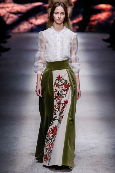 Arriva direttamente da una corte rinascimentale, la donna vestita dalla stilista italiana Alberta Ferretti, tra atmosfere calde e rinascimentali che sembrano tratte direttamente da un dipinto d’epoca