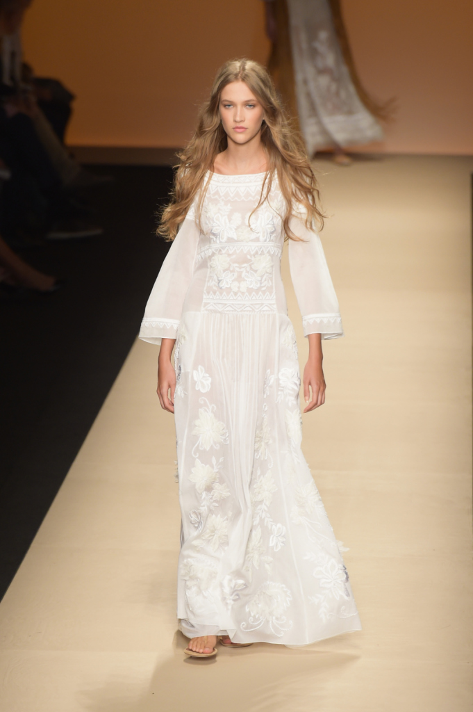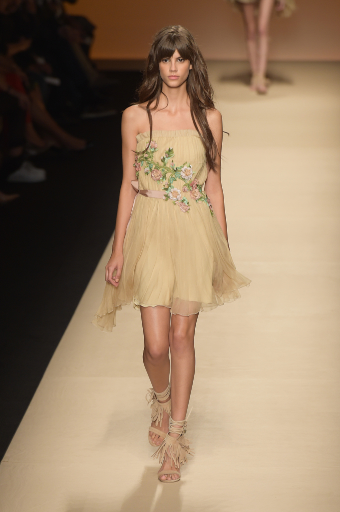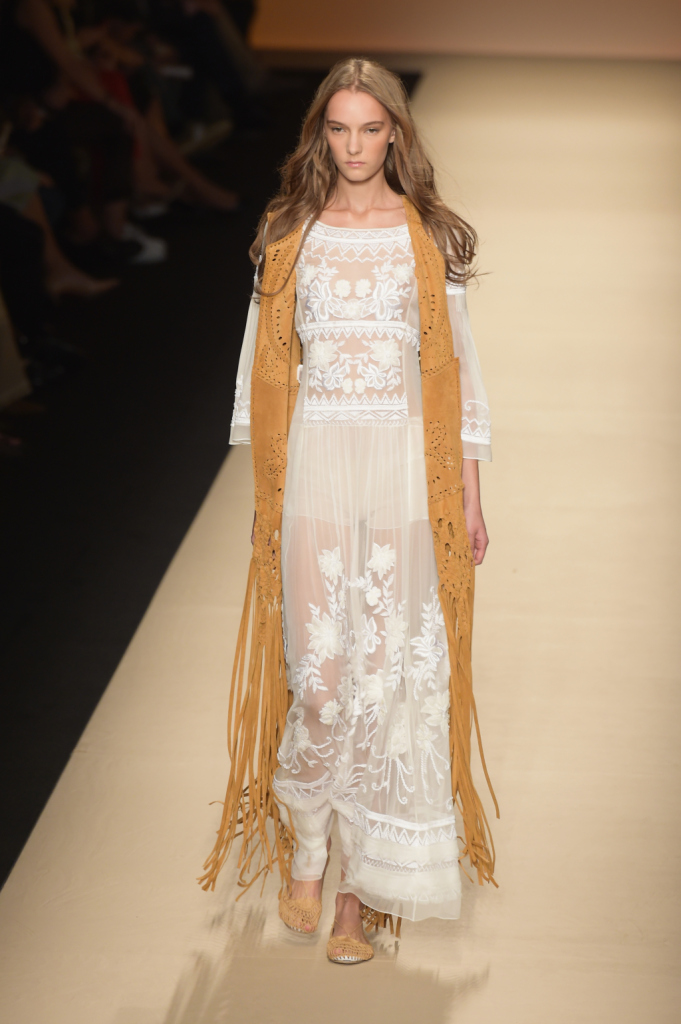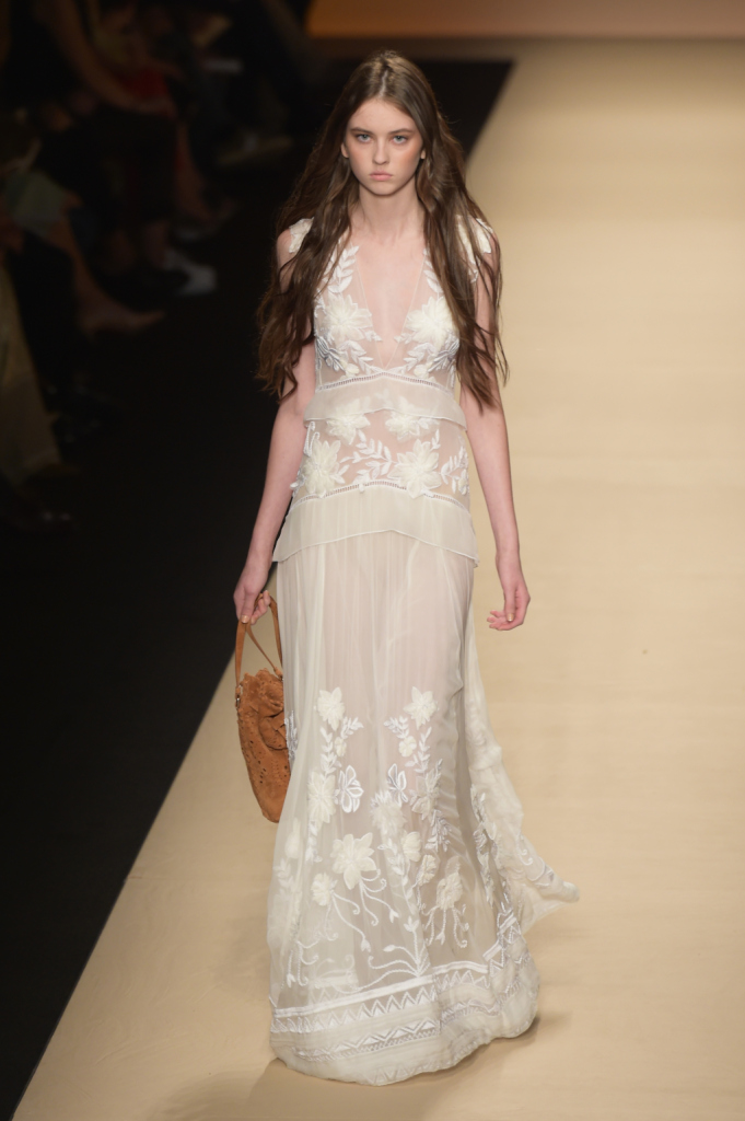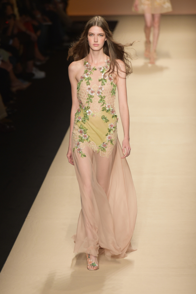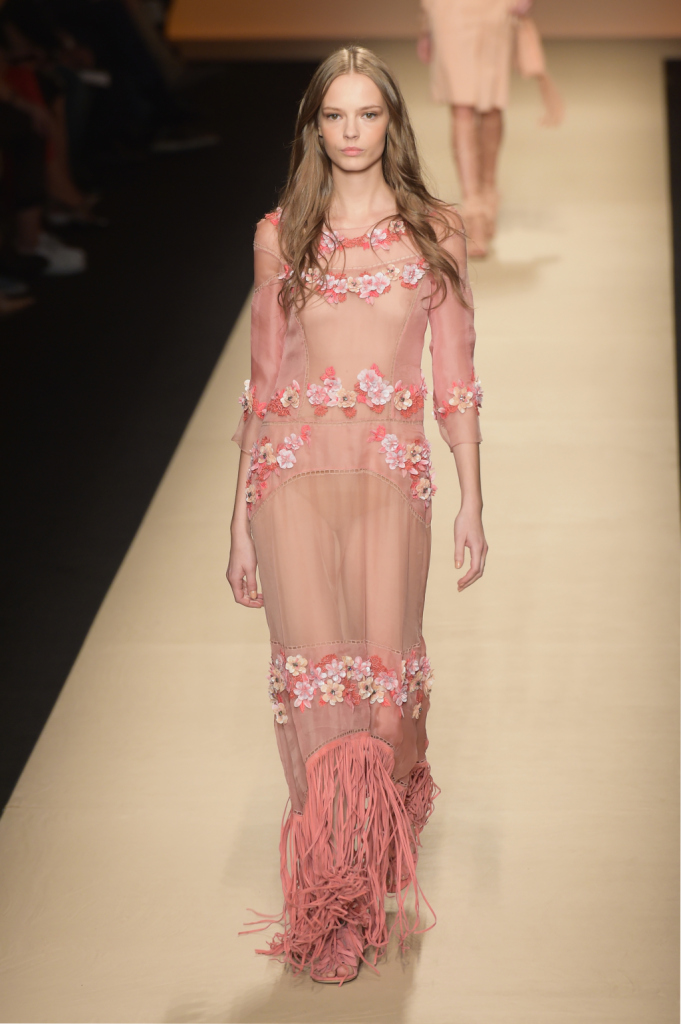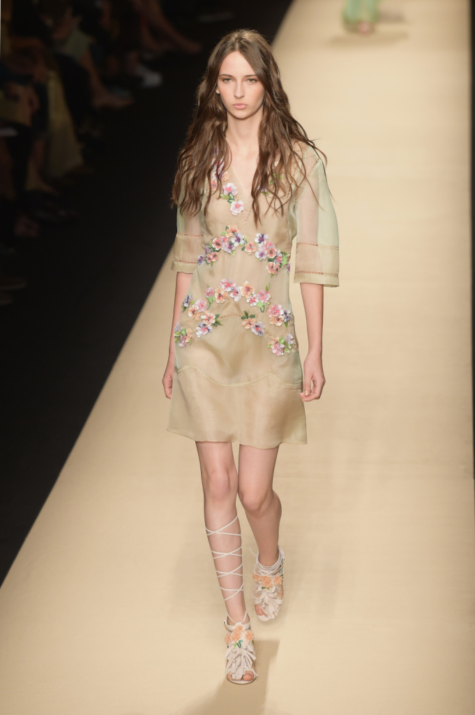 Tessuti leggeri, colori romantici, sensuali trasparenze in un gioco delicato di fiori e pizzi: la collezione primavera/estate 2015 Alberta Ferretti tra l’etereo e il boho-chic.