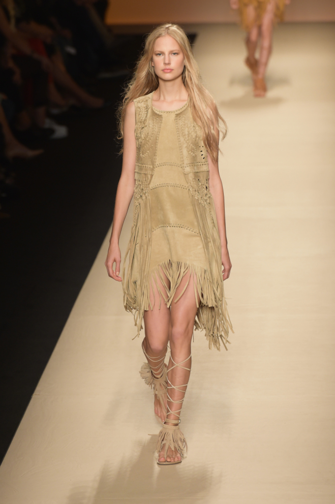 Un altro elemento che fa la sua comparsa nel corso della sfilata, secondo leit motif della collezione, è la frangia: declinata in tutti i colori e tonalità, dal lavanda al rosa acceso al pervinca, adorna i bordi di top e abiti velati, trasformando l’atmosfera bucolica in un mood anni Settanta, una rivisitazione dello stile hippie in chiave più elegante, una specie di boho-chic dai contorni romantici ma decisi. Bellissimo l’abbinamento di abiti lunghi in organza bianchi, riccamente ornati e dai dettagli preziosi, con gilet in camoscio color cuoio o terra bruciata, che danno ancor più fluidità al tutto grazie all’aggiunta di una cascata di frange.