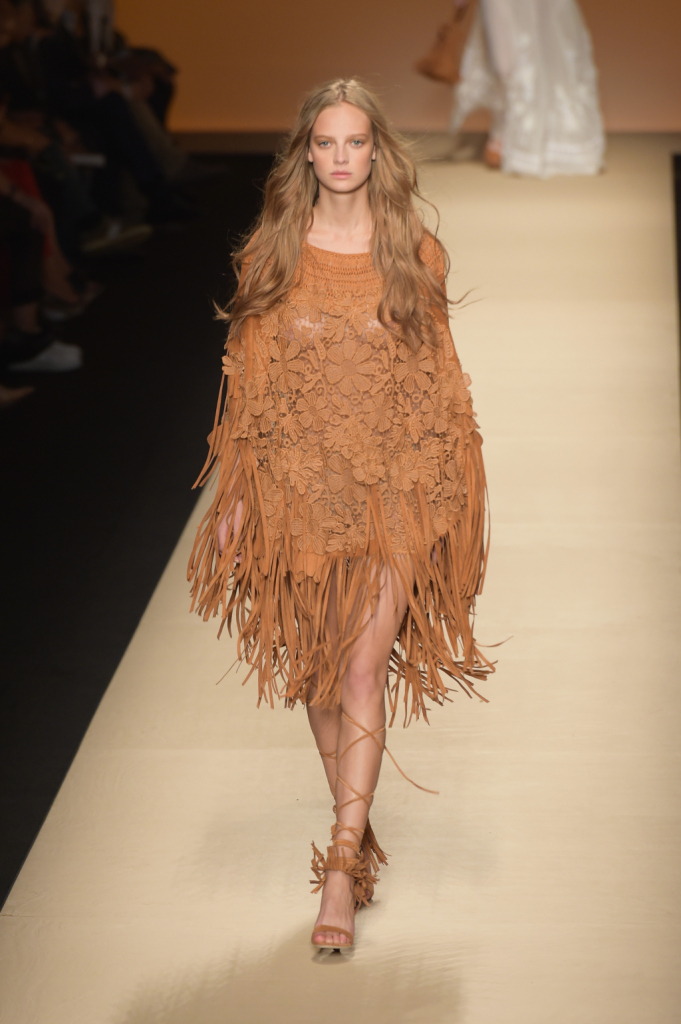 Alberta Ferretti, MFW, collezione Primavera-Estate 2015: miniabito in camoscio con gilet sfrangiato