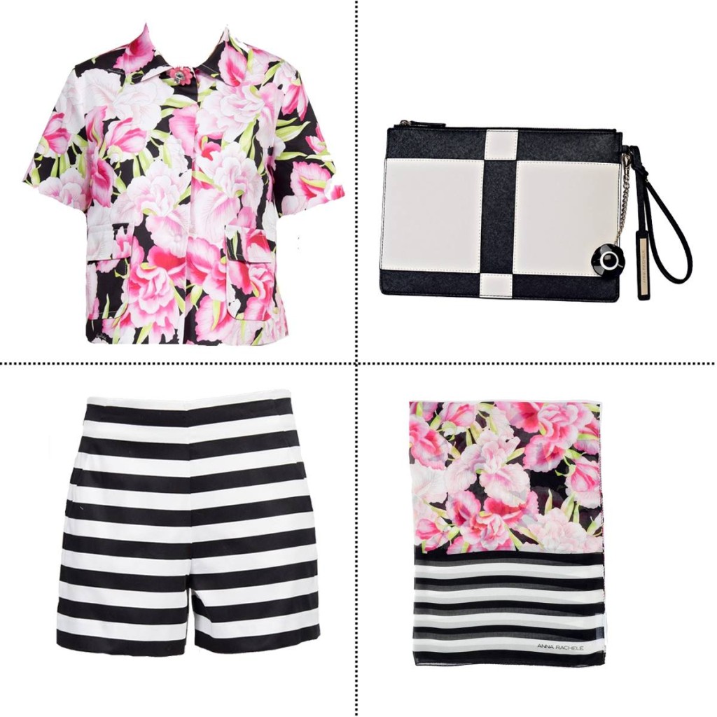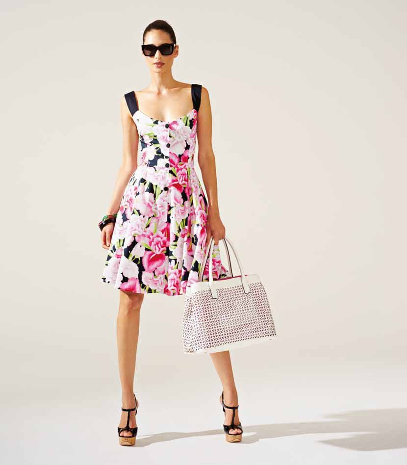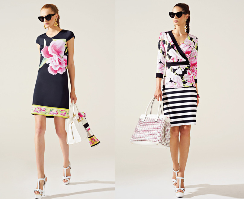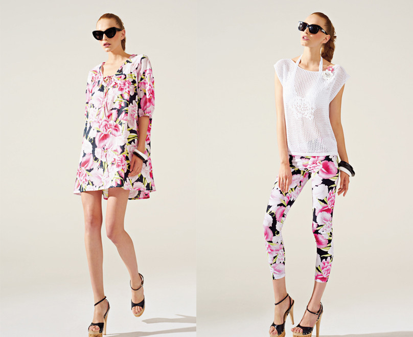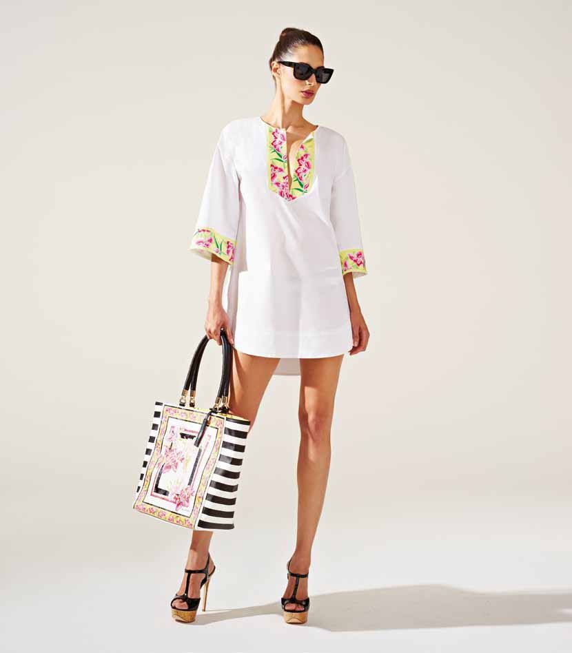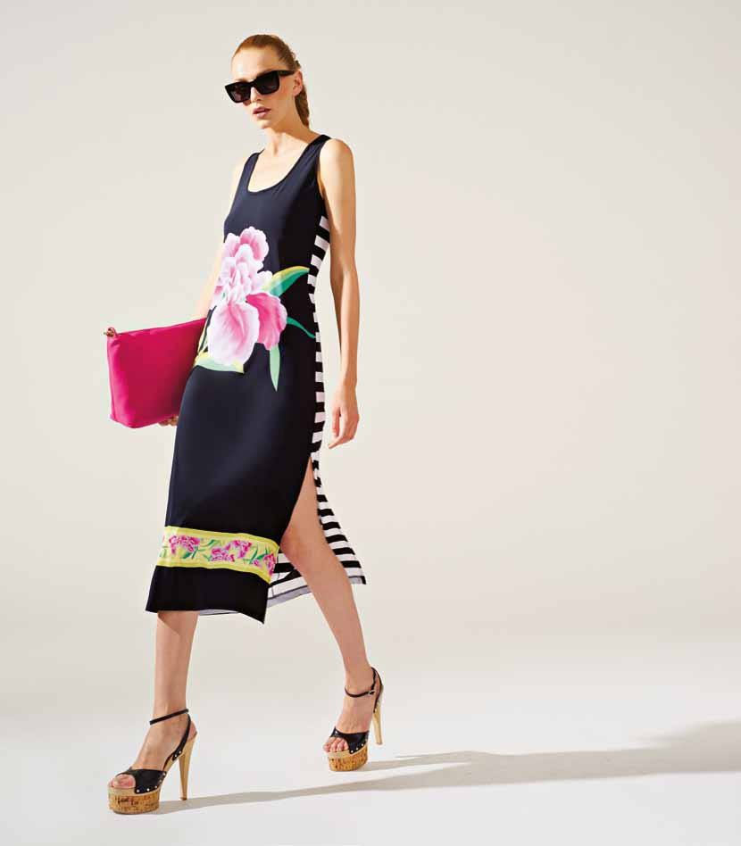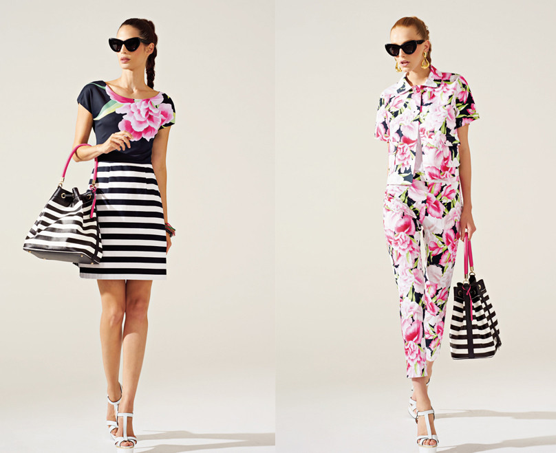 Fra le proposte più amate della collezione spiccano i vestitini realizzati nelle tonalità bianco e nero, decorati con strisce orizzontali e decori floreali fucsia. Per un total look in tema capri sono previsti sandali bassi con strass o alti con zeppe e borse tono su tono.