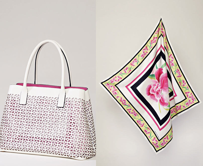 Gli outfit proposti dalla collezione sono accompagnati da accessori in tema, borse e foulard per un look completo in perfetto stile bon ton.