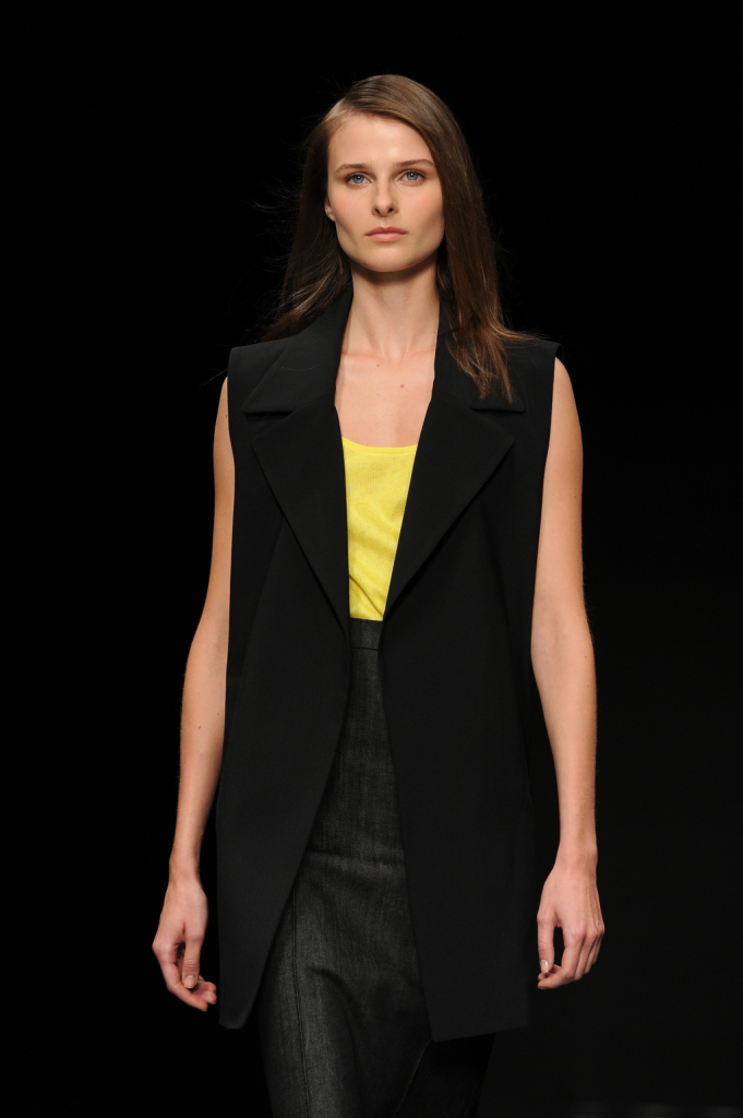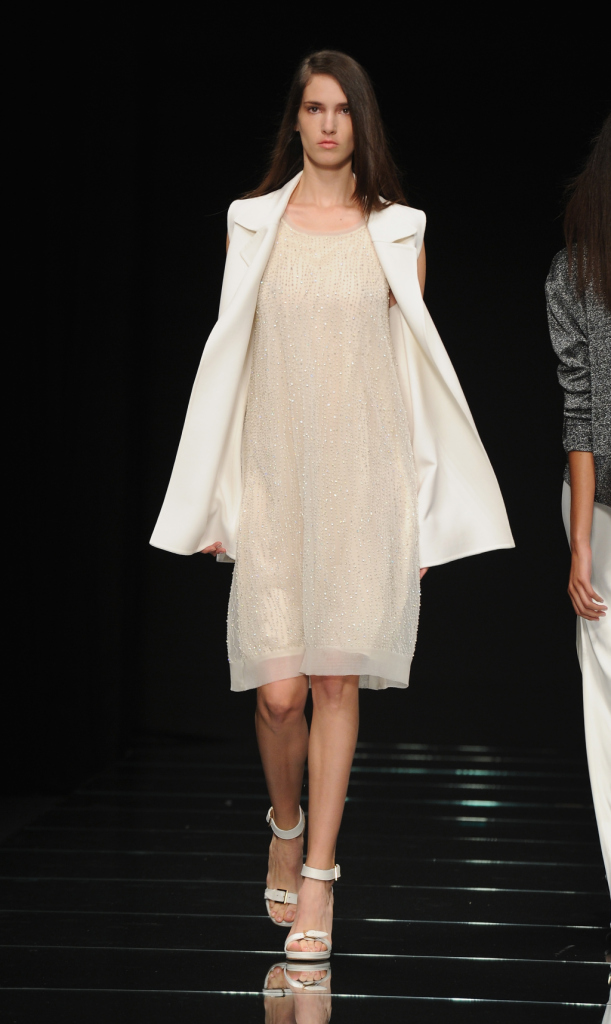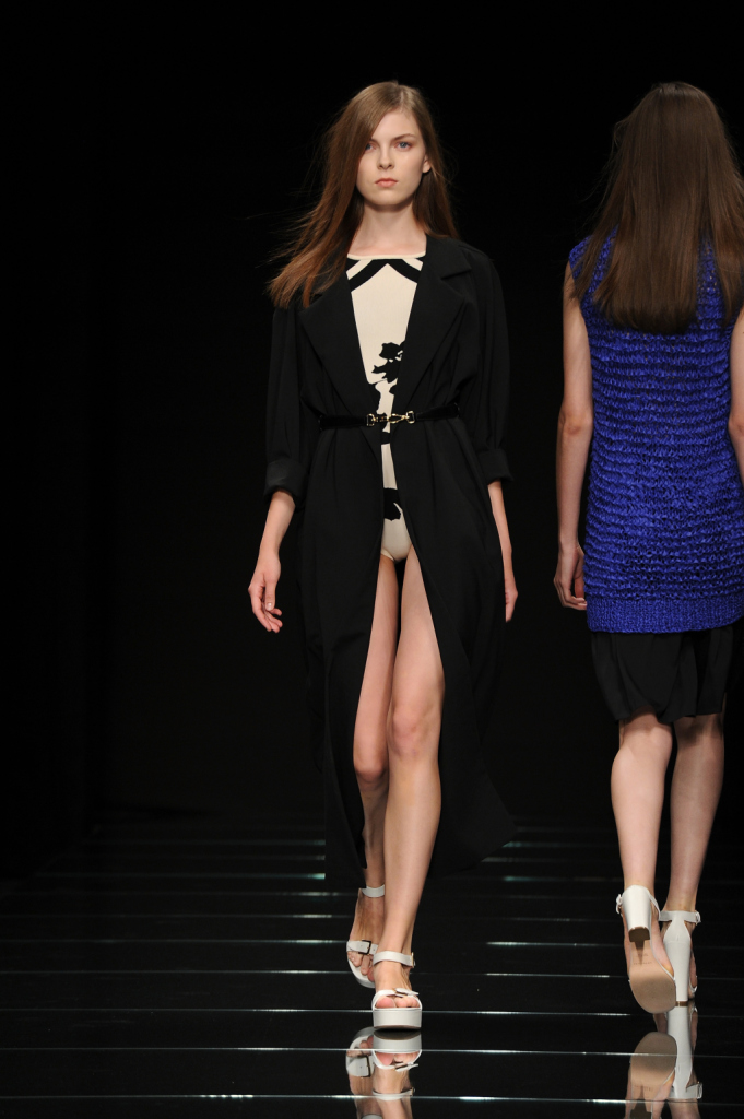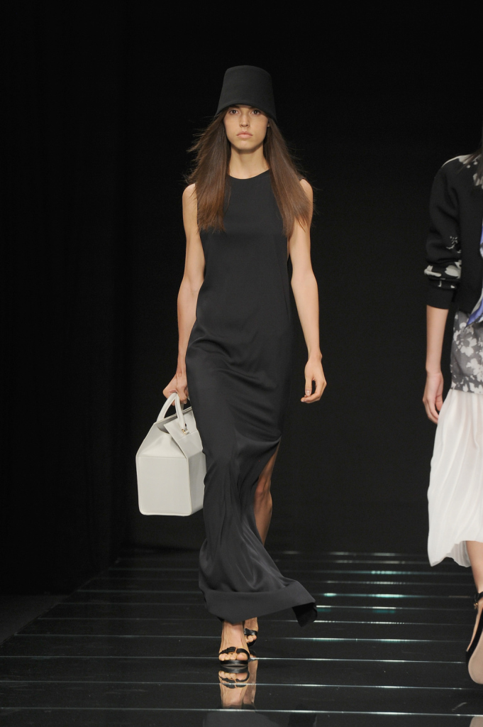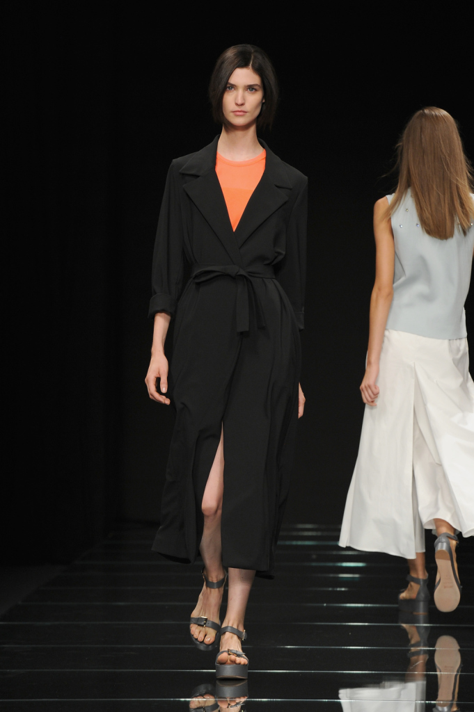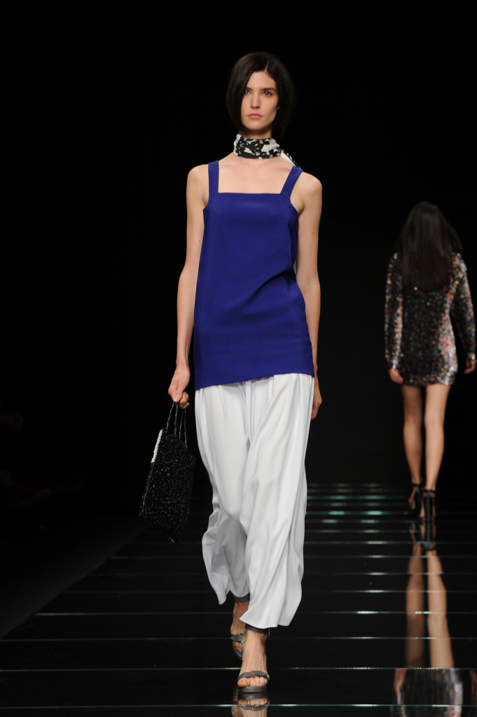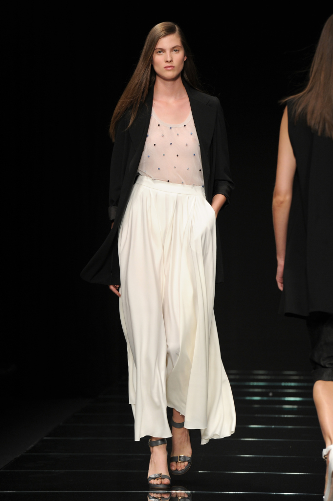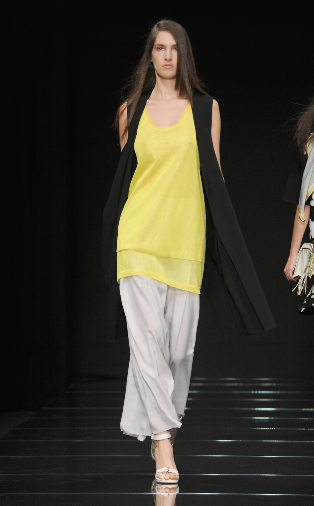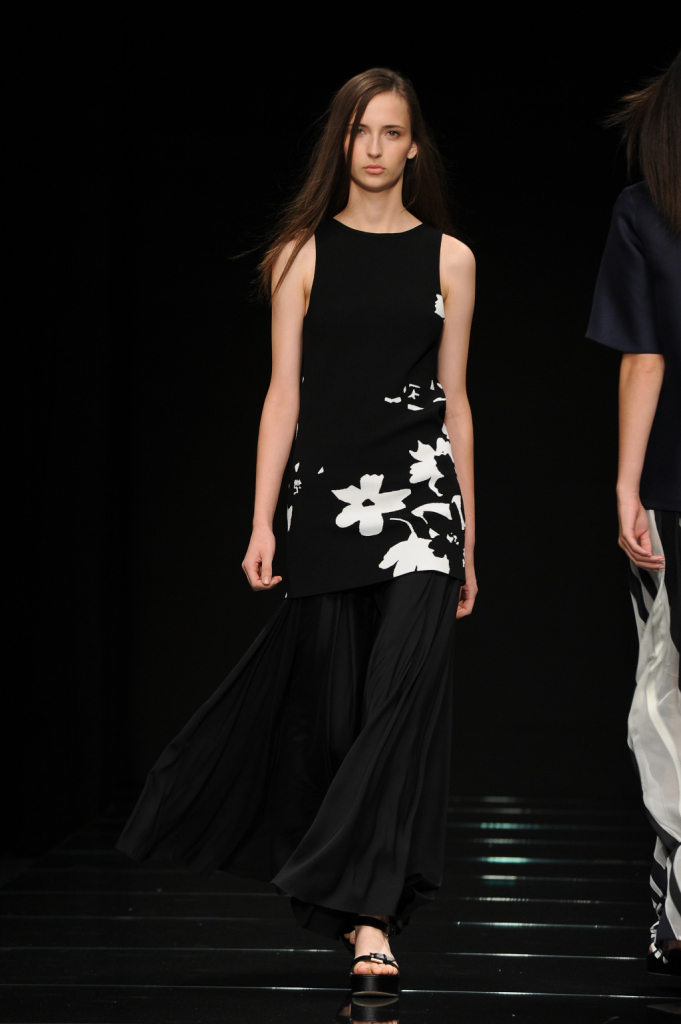 Primo, perché gli abiti proposti riescono a essere decisamente chic nella semplicità di linee morbide e dritte e di una palette estremamente rarefatta, con bianco e nero che dominano incontrastati e affiancati soltanto da una manciata di altri colori: toni di grigio, blu e azzurro, giallo, rosa, arancione. Top, gonne e giacche abbondanti dove non decisamente oversize, pantaloni loose, caftani in stile orientale, lunghi gilet, poche e studiatissime stampe – tra il floreale e il floreal/mimetico –, e altrettanto non numerose ma assai sapienti trasparenze: le linee più sinuose sono lasciate per gli outfit serali, come nel vestito lungo nero con spacco laterale e nei due corti tutti paillettess effetto shining.