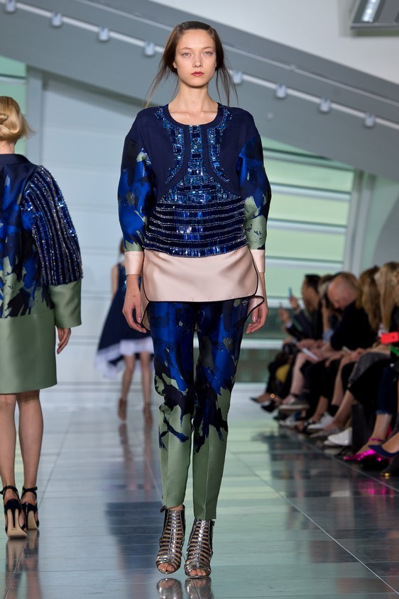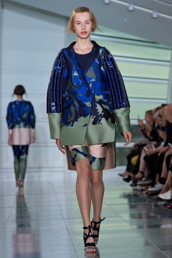 Lo stilista propone per la prossima bella stagione, inizialmente capi oversize. Infatti il fashion show, si apre con dei modelli di giacche strutturate dalle proporzioni esagerate, blu scintillante, che accompagna a shorts in raso, leggermente attillati; oppure – sempre per quanto riguarda capi dalle grandi dimensioni – troviamo anche dei blazer dal taglio maschile, indossati con pantaloni dritti dalla fantasia colorata, molto eleganti, o con pantaloni larghi a zampa di elefante.