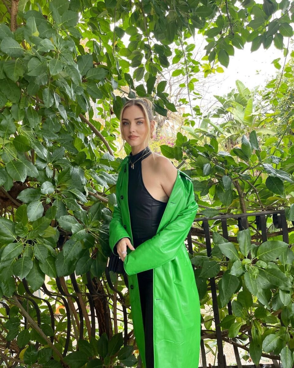Il trench coat è un trend della primavera 2022 ed è un capo perfetto per i viaggi: ripara dalla pioggia e aggiunge un tocco chic al look. Chiara Ferragni lo ha scelto nel colore di tendenza della stagione, il verde prato, che abbinato al nero è perfetto. Molto probabilmente, si tratta di un modello di Bottega Veneta, che costa 5.750 euro.