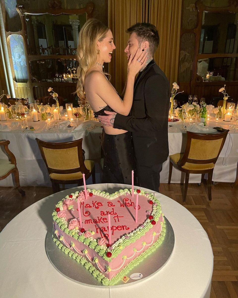 Davanti a una bellissima torta con 5 candeline, a indicare sia i 35 anni dell’influencer e sia i loro 5 anni d’amore, Fedez e Chiara Ferragni si sono scambiati un bacio appassionato. Sulla torta c’era scritto: “Make a wish and make it happen”, cioè “esprimi un desiderio e fai che si realizzi”. Loro ci sono riusciti.
