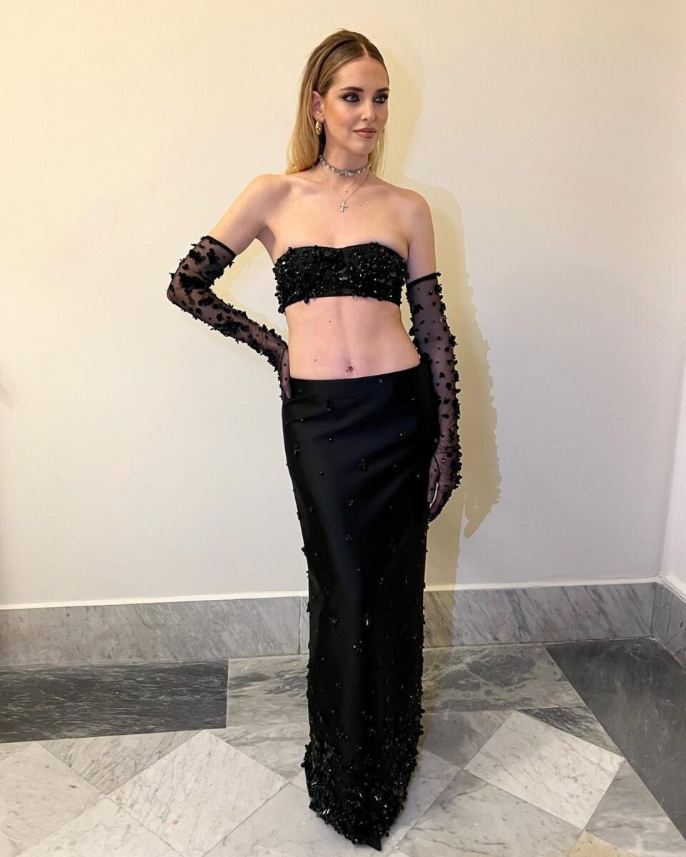 Chiara Ferragni ha di nuovo scelto un dark look: questa volta un meraviglioso abito di Miu Miu. Microtop nero, gonna lunghissima e, per completare l’outfit, un altro trend di stagione: i guanti da sera. Fedez indossava un completo nero abbinato a quello della moglie.