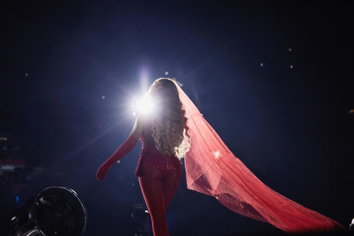 In occasione della sua esibizione ad Atlanta, Beyoncé ha indossato una creazione firmata appositamente per lei da Alberta Ferretti. Come si può vedere dal bozzetto, e poi dall’effetto finale “on stage”, la regina del pop mondiale aveva un body ricamato con macro volants in lurex plissé rosso e guanti abbinati. In testa, un velo rosso da vera diva.