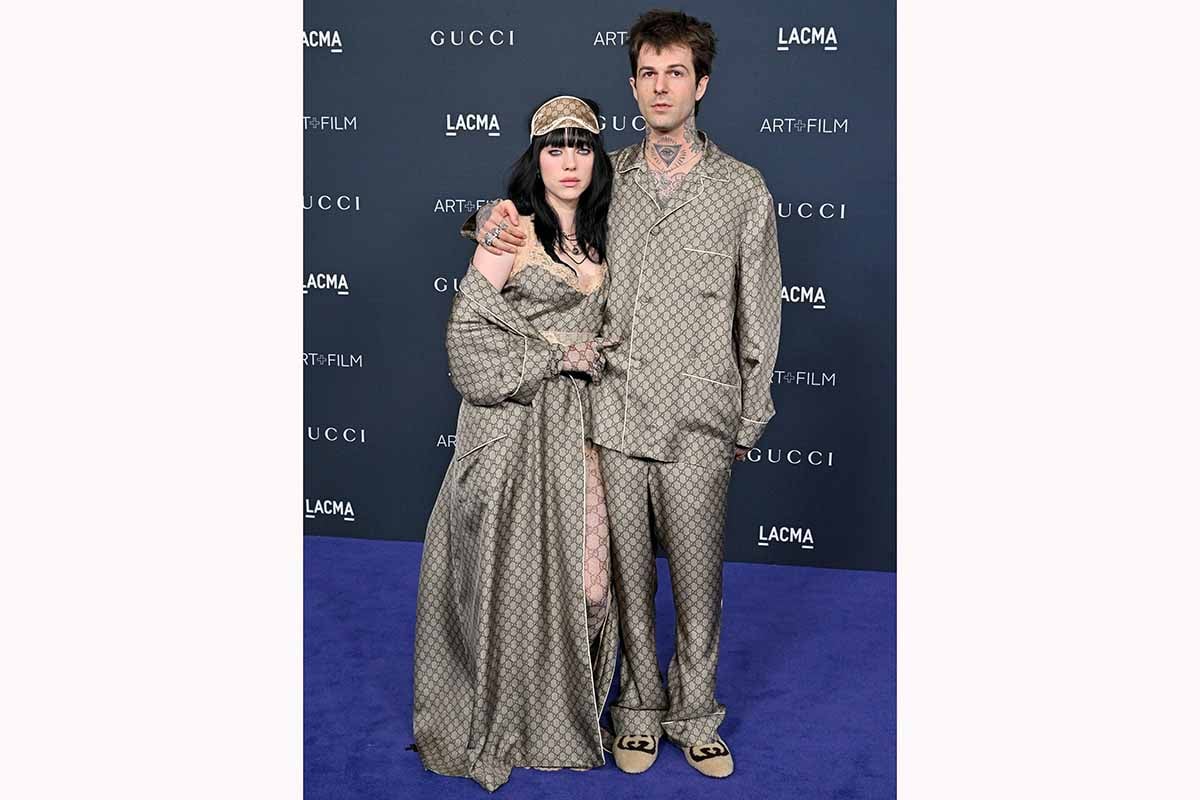 Billie Eilish indossava una camicia da notte senza maniche, bordata di pizzo e abbinata a una vestaglia lunga fino al pavimento. Rutherford sfoggiava camicia e pantaloni di seta con il logo della maison all over. Entrambi indossavano anche scarpe Gucci, mentre Eilish ha completato il suo look con una maschera per gli occhi sempre con il monogramma del brand.