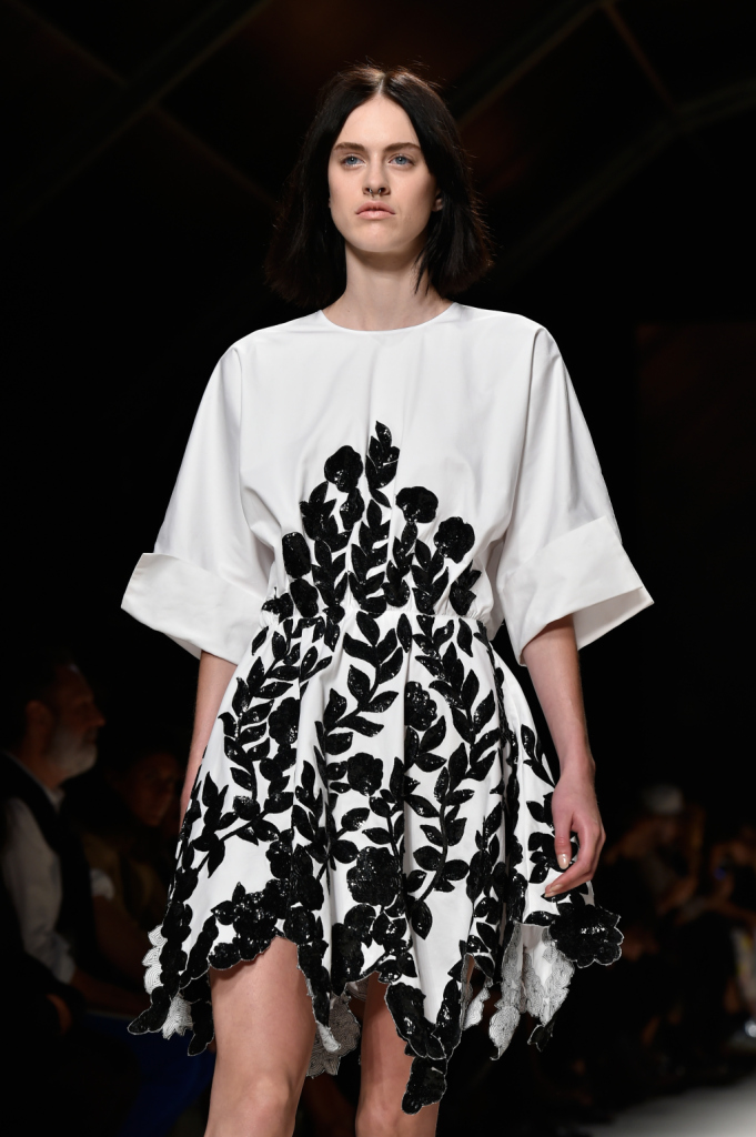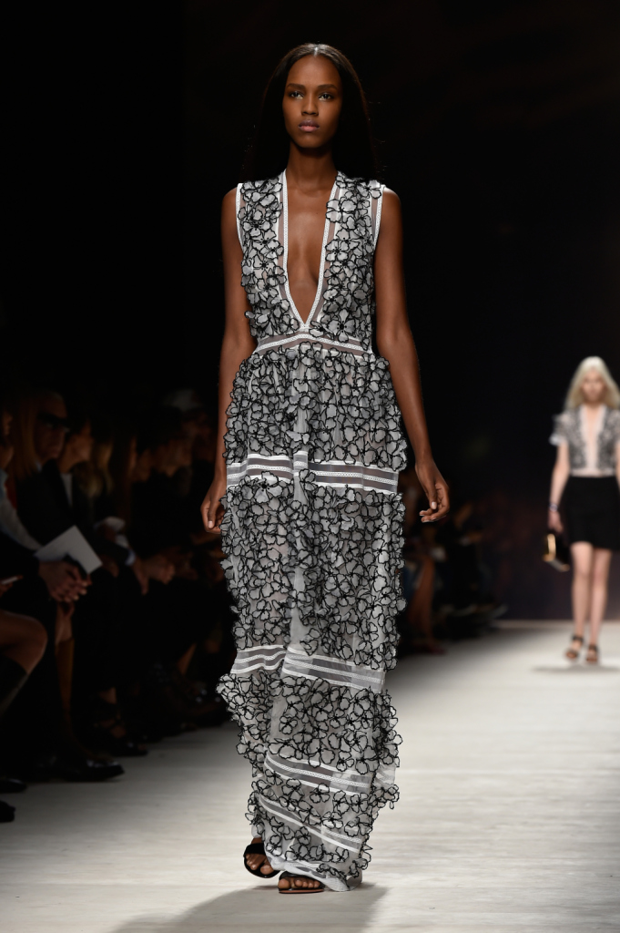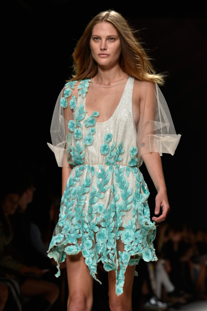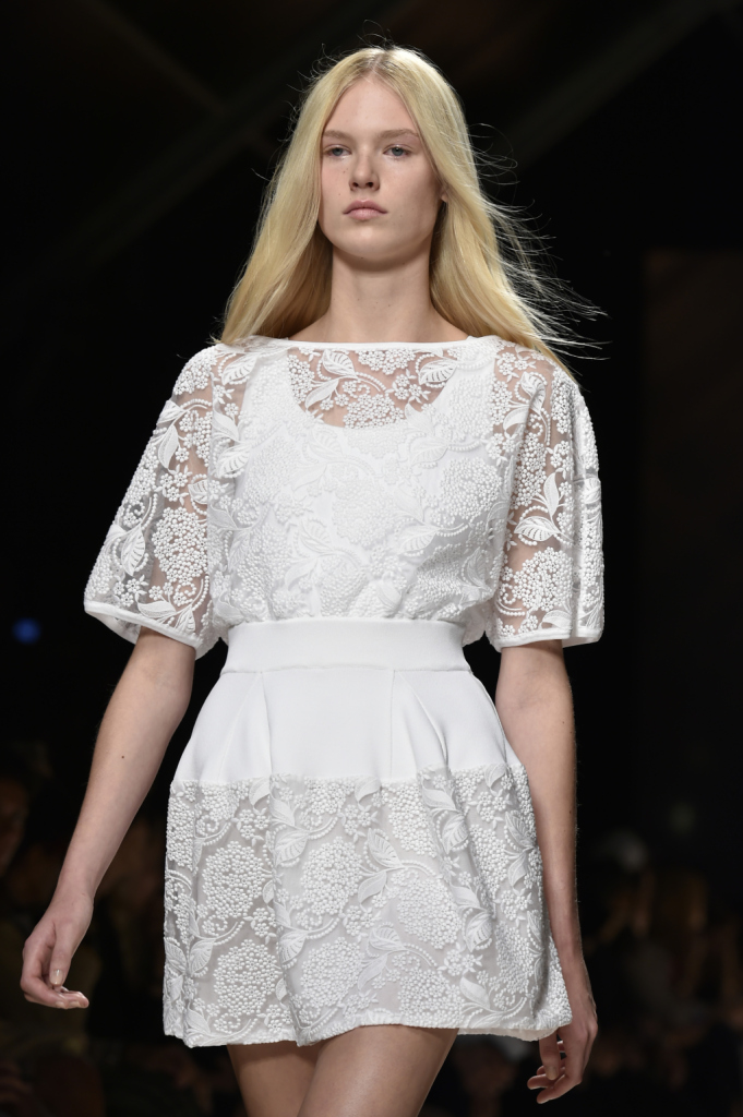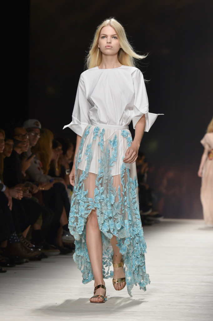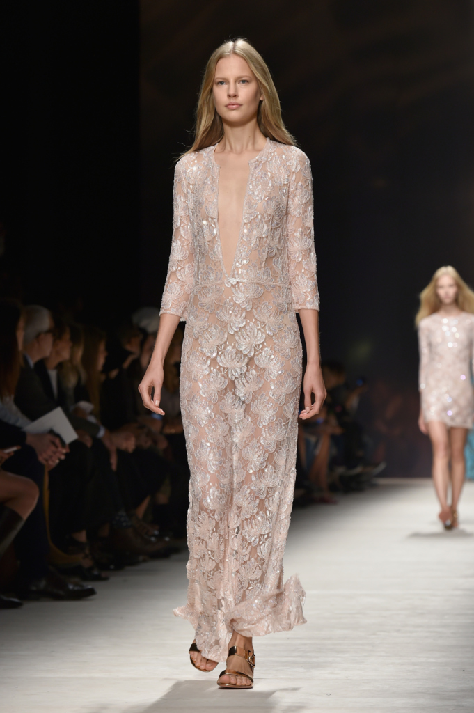 Lungo o corto, è il vestito il grande, indiscusso e anzi unico, protagonista. In tonalità tenui e neutre, nella leggerezza di chiffon, organza e seta, in trasparenze sensuali ma insieme posate, nella candida essenzialità di tubini bianchi, con il tocco acquamarina, rosso, turchese, lilla o verde, delicato e raffinato dei fiori ricamati, prezioso ed etereo degli inserti sparkling. Infine, per la prossima ss 2015 Blumarine propone poco nero, da solo o in combinazione col bianco, in abiti chic e bon ton come la bellissima blusa white con ricami floreali black che germogliano da uno zigzagato profilo inferiore e in quello lungo da sera, tutto trasparenza e ricami, unica concessione a una sensualità più esibita.