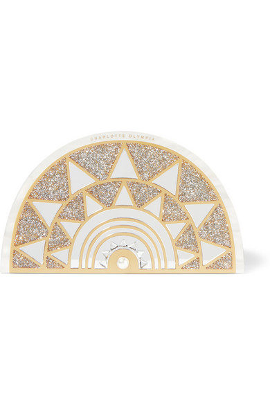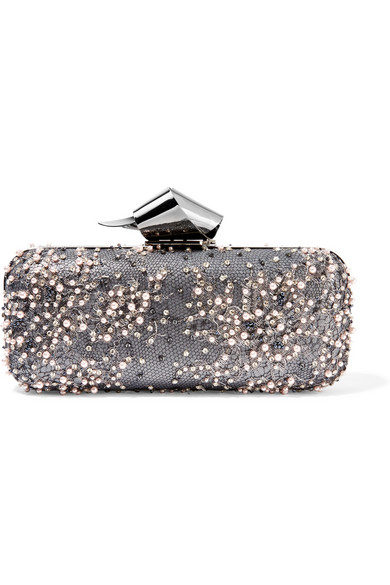Per un outfit o un’occasione importante sono perfette la clutch Irona a forma semi circolare e tempestata di cristalli firmata Charlotte Olympia (1.295 euro) e quella in pizzo, con perle e schegge scintillanti, di Jimmy Choo (1.995 euro).
