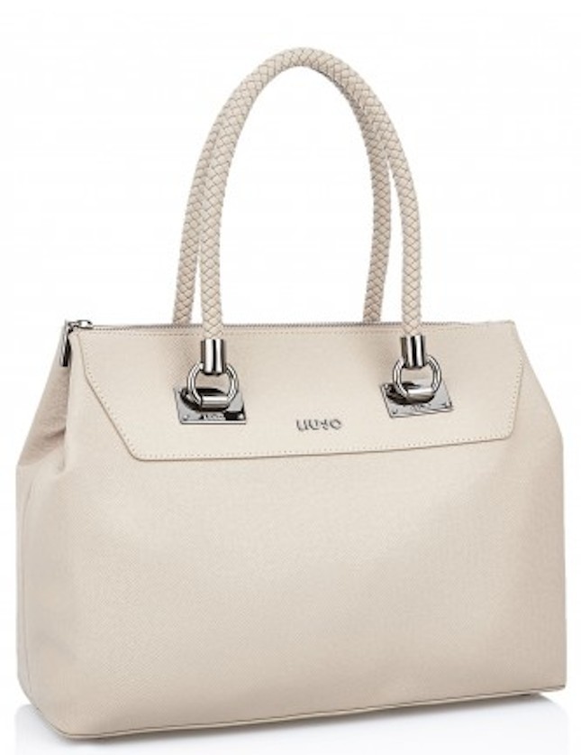 PRATICA chiusura con zip e doppi manici con catena DORATA intrecciata al materiale principale. Piccola taschina frontale con zip e logo Liu Jo metallico applicato. Possibilità di tracolla.