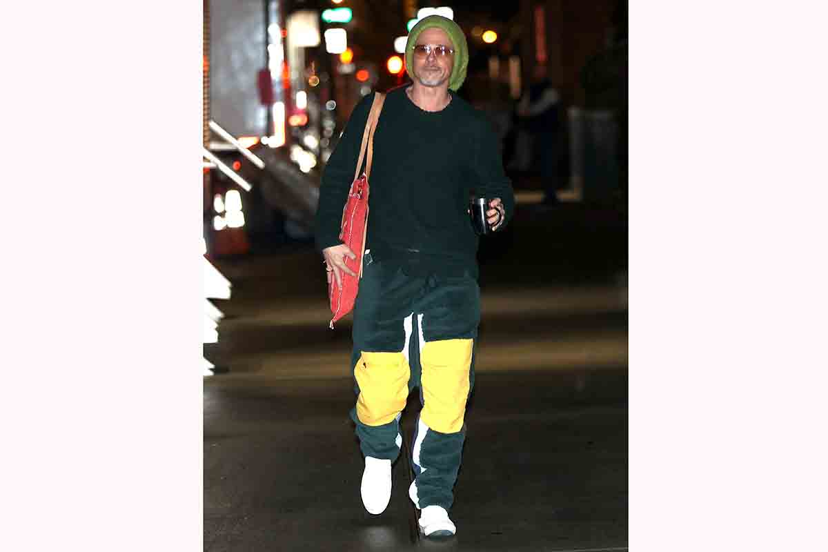 Sul set i due attori vestono in maniera praticamente identica, salvo quando non sono intenti a girare una scena. Fuori dalla recitazione, infatti, Brad Pitt sfoggia look giovanili e dal sapore cozy, che non gli avevamo mai visto. Come quello composto da un maglione tie-dye bianco e beige dall’effetto destroyed e pantaloni in pile con le ginocchiere e bande laterali bordeaux. Sotto il maglione, ha indossato una t-shirt. Sopra, invece, una giacca a vento con un muppet hat coordinato. L’attore ha completato il suo look con scarpe slip-on e occhiali da sole neri.
