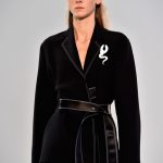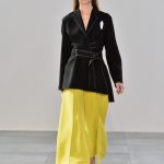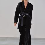 C’è il DNA Céline in questa collezione: dai pantaloni, che in alcuni casi si allargano e diventano quasi una gonna, alla centralità del punto vita, evidenziato ora da cinture filiformi, ora da intrecci asimmetrici sugli abiti o su giacche e cappotti, ora da aperture laterali. Fino ai capi spalla, scomposti e riassemblati in forme che, magicamente, sembrano essere così da sempre. Lo stesso effetto “instant classic” che hanno dettagli come le grosse tasche, le fasce al braccio, le frange sotto ai vestiti. In ognuno di questi look c’è qualcosa fuori posto ma in grado di diventare subito un elemento che non poteva essere altrove, non poteva essere diverso.
