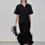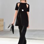 Scollo asimmetrico, tagli, top che rimanda al peplum, total black – Céline SS 2015