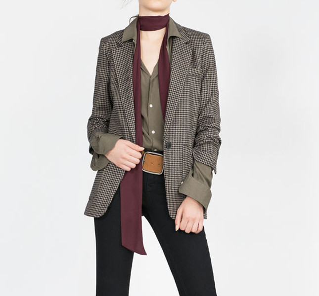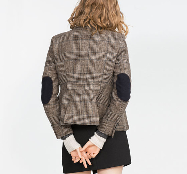 Imperdibile è la giacca a quadri con toppe firmata Zara, perfetta da indossare in ufficio con un pantalone slim nero e ballerine oppure, per un look più informale, con mini skirt nera e stivaletti tono su tono.