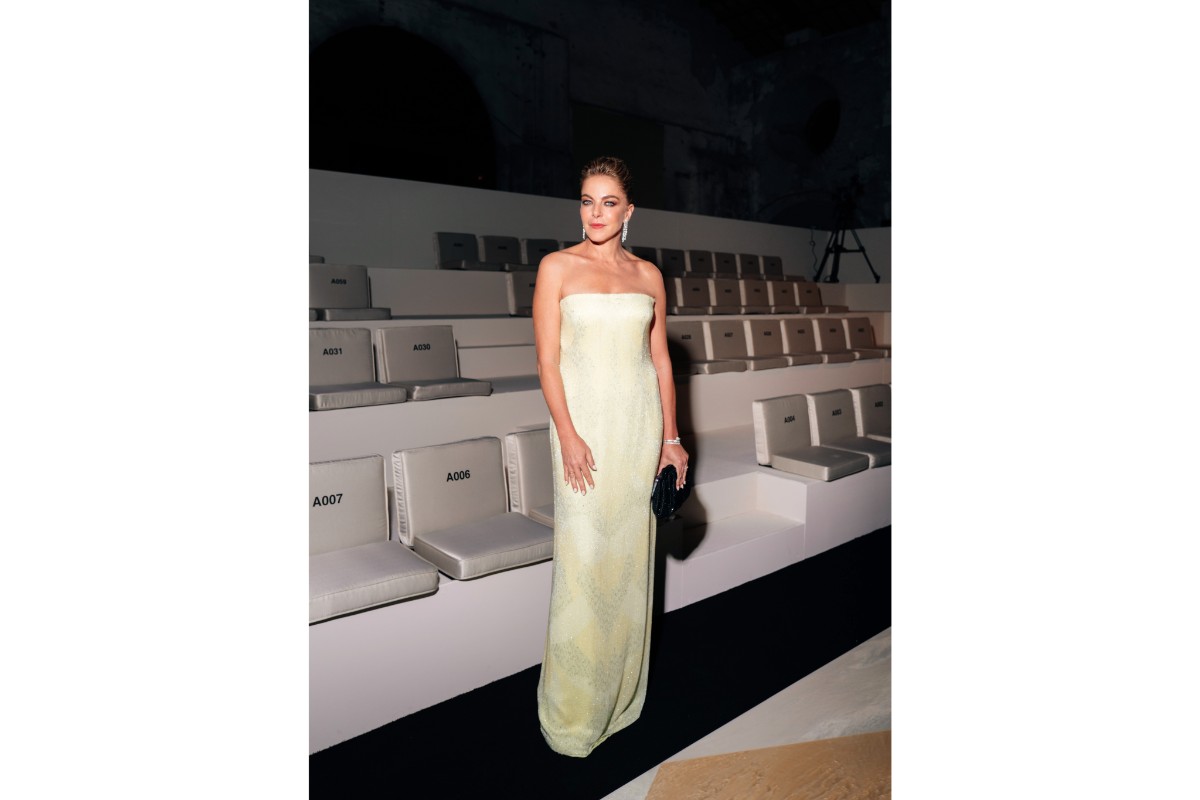 Una pioggia di stelle tra cui celebri modelle che hanno sfilato spesso per lui. Per esempio Eva Riccobono che ha scelto un outfit rosso fuoco composto da un abito a sirena e una pelliccia eco voluminosa.