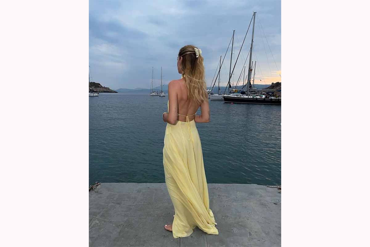 Ma cosa succede se una fashion influencer si reca su un’isola greca? Inevitabilmente vestirà come una dea scesa dall’Olimpo sulla Terra. È quello che Chiara Ferragni ha fatto per l’ultima serata con le amiche. L’imprenditrice digitale ha sfoggiato un abito fluttuante in un delicato giallo pastello. Lungo, morbido, sinuoso, con le fasce intrecciate sul seno, il vestito scelto da Chiara Ferragni fa parte della collezione Primavera-Estate 2022 di Etro. Costa 2.800 euro.