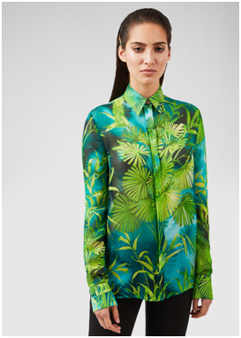 Nelle fantasie come nel color block il verde è ovunque. Nelle bellissime fantasie dei tessuti proposti dalla maison, la vegetazione lussureggiante è fatta di foglie, fiori e frutta.