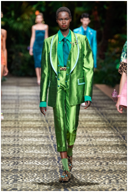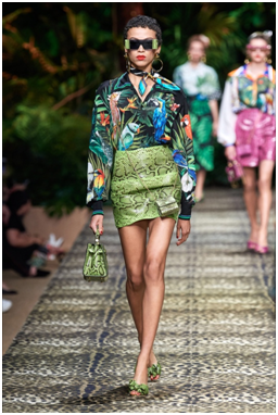 Un inno alla natura la sfilata firmata Dolce & Gabbana primavera-estate 2020, dal titolo Sicilian Jungle. Declinati i toni del verde, dal verde acceso cangiante al verde smeraldo. Il verde della vegetazione lussureggiante accompagna gli outfit di tutta la sfilata.
