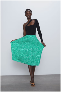 Si potrà indossare nei tessuti fantasia dove il fondo prevale sui toni verdi. La proposta di Zara nella blusa fantasia con diversi toni di verde su fondo nero, ci suggerisce come abbinarlo malgrado il nostro incarnato.