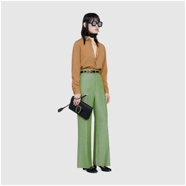 Anche il pantalone verde chiaro a gamba ampia, effetto vintage, abbinato alla camicia in crepe di seta GG sabbia è un’ottima e facile idea per un look trendy.