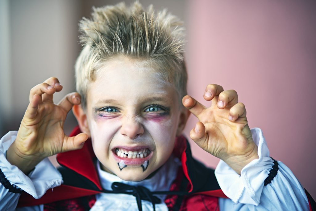 Ma quanto sono carini i vampiri? Che si ispirino a Bella e Edward, gli indimenticabili protagonisti di Twilight, o ai vampiri più sanguinosi, il trucco per bambini a tema vampiri non può non avere i denti finti e del sangue rosso che scende dalla bocca.