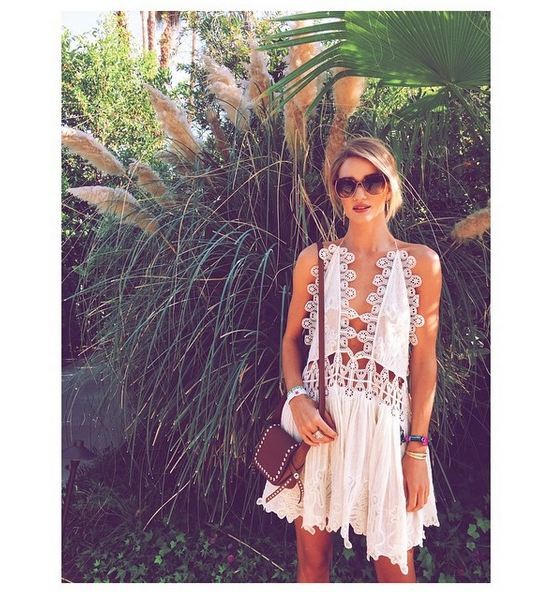 Un altro outfit casual è quello di ispirazione anni Settanta, indossato al Festival di Coachella 2015: abito bianco corto con gonna larga e leggermente svasata, tessuto leggero in cotone, pizzi e ricami.