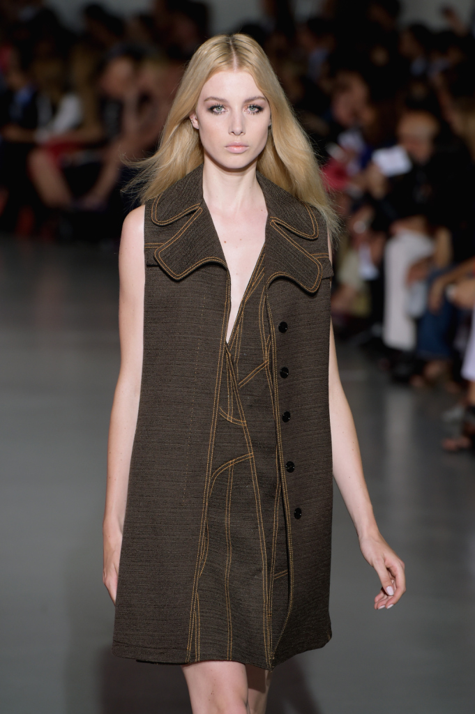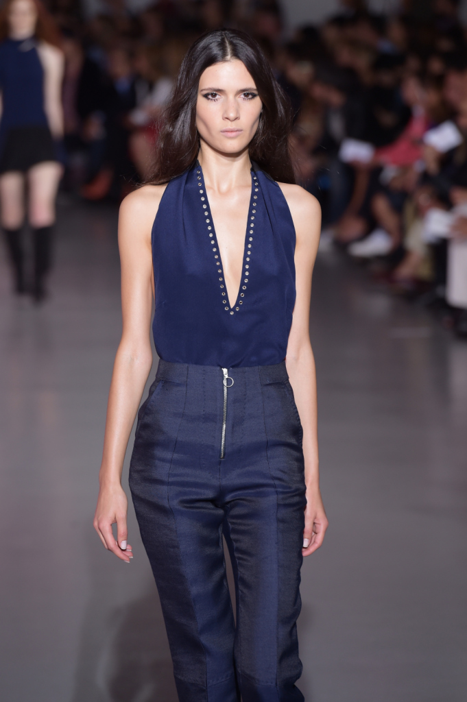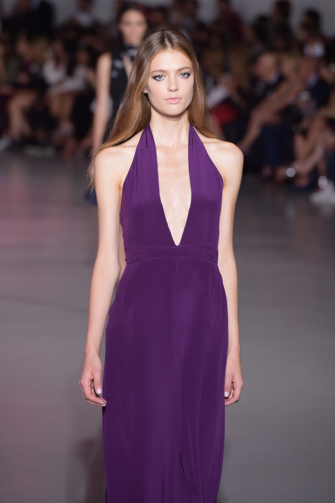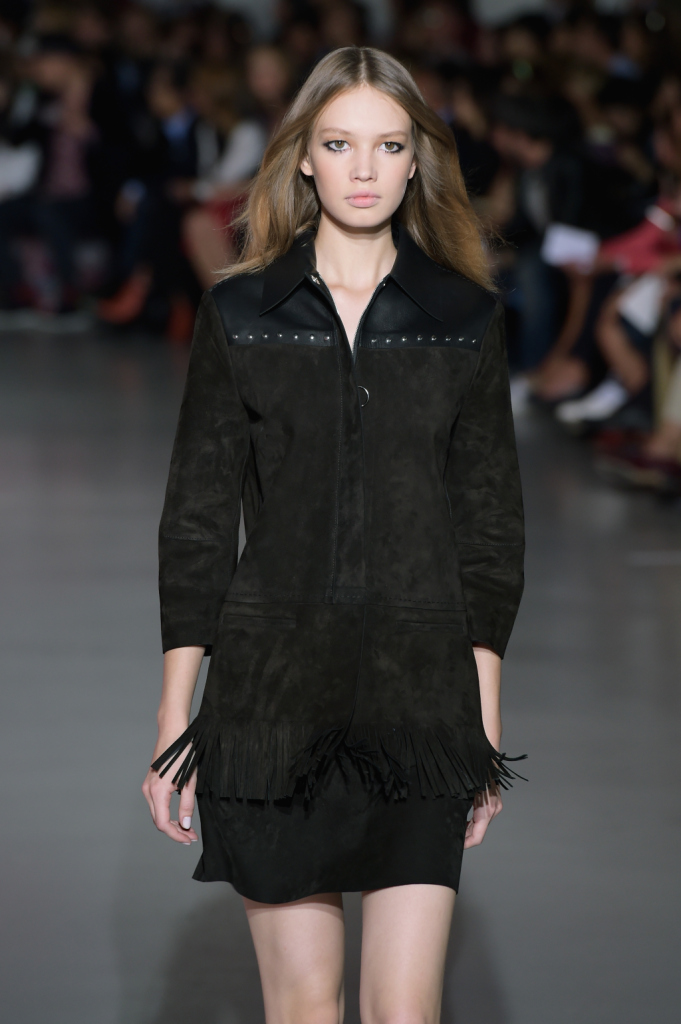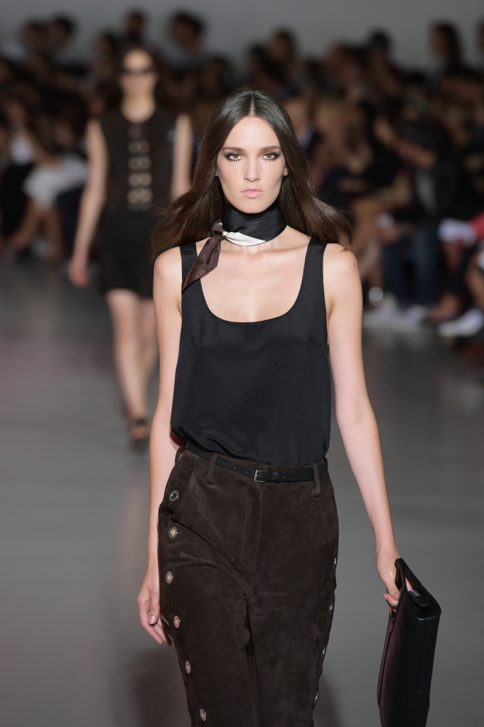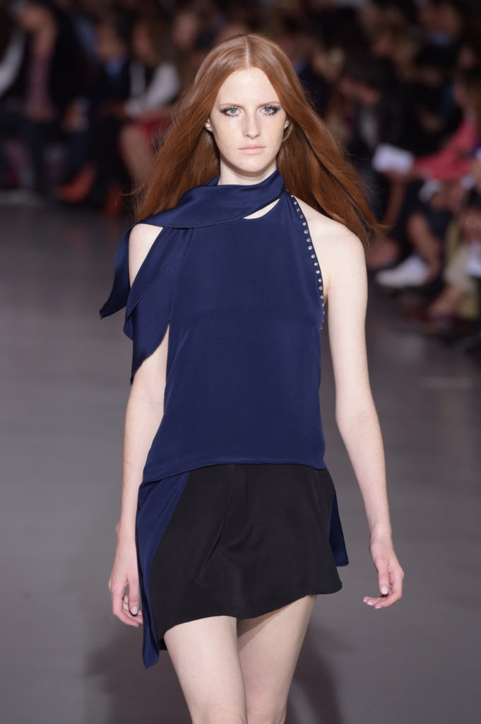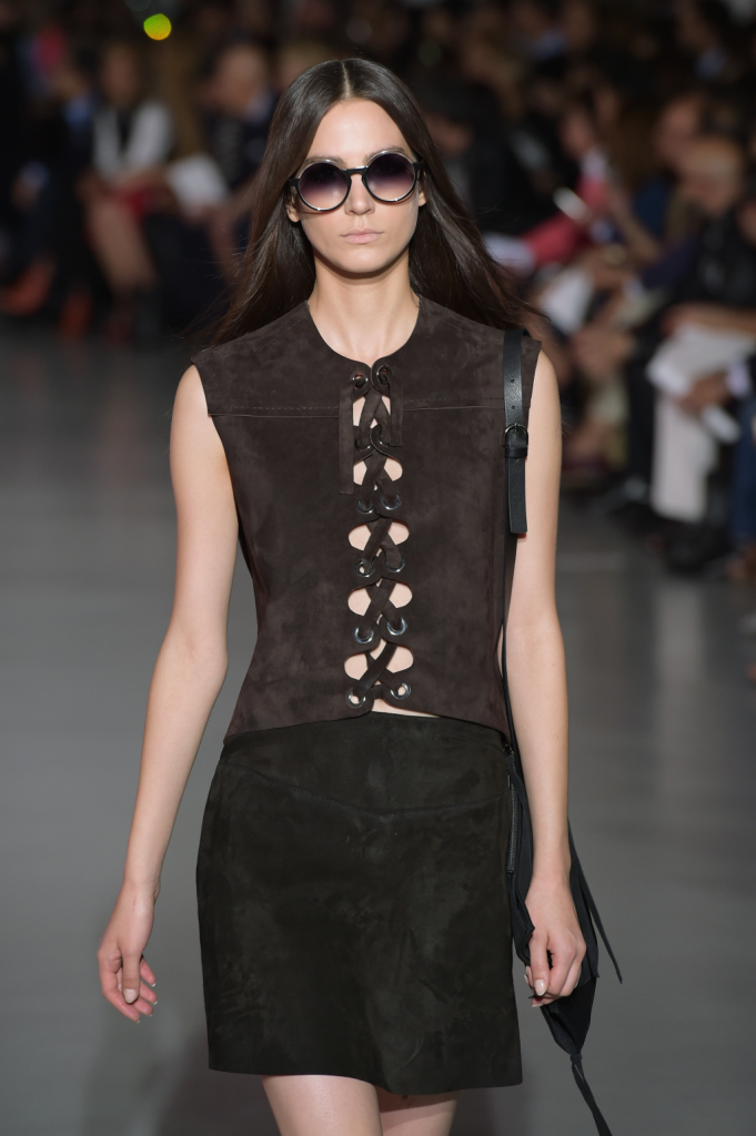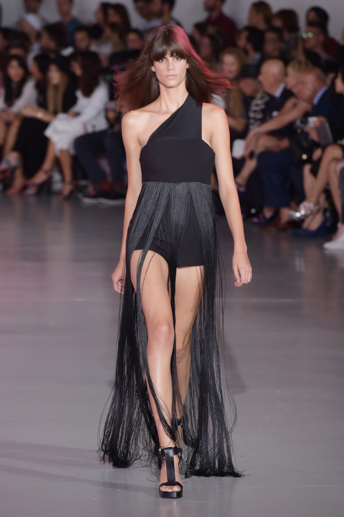 Così, in passerella sfilano per la ss 2015 abiti dai tagli netti e asimmetrici, lunghi gilet, pantaloni e shorts a vita alta e altissima, gonne mini ma anche lunghe, tubini in techno pizzo macramé. La palette comprende molto, moltissimo cioccolato (ovvero, camoscio), blu, viola prugna e tanto nero per gli outfit serali, ricchi di di chiffon e frange.