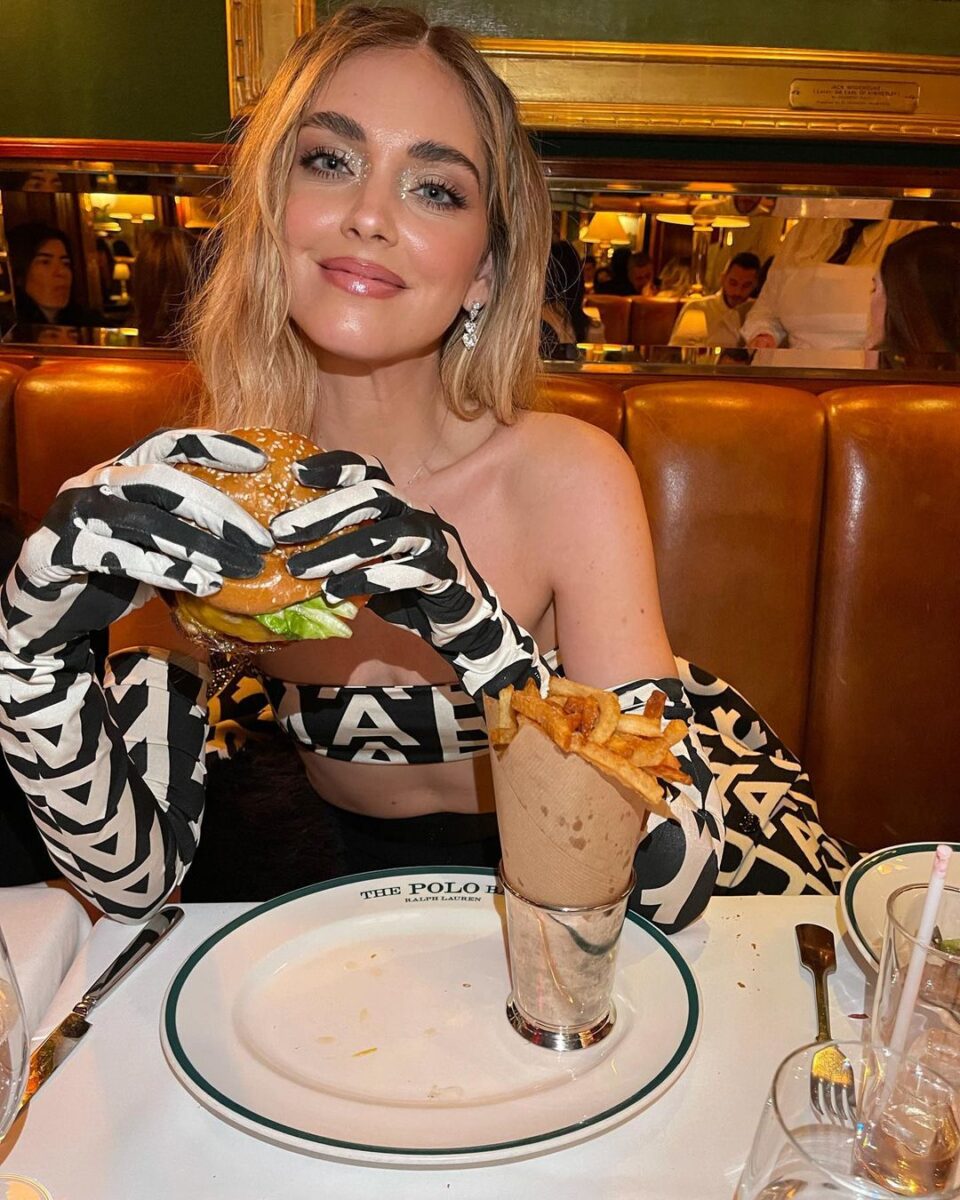 Chiara Ferragni mangia l’hamburger con i guanti da sera (ph Instagram @chiaraferragni)